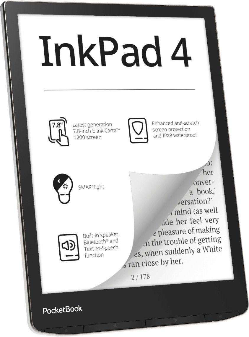 PocketBook InkPad 4 received the latest 7.8-inch E Ink Carta™ 1200 screen with a resolution of 1404 × 1872 and 300 PPI. Thanks to this technology, the e-page has become 15% more contrasty, and the response speed of E Ink has improved by an impressive 20%.