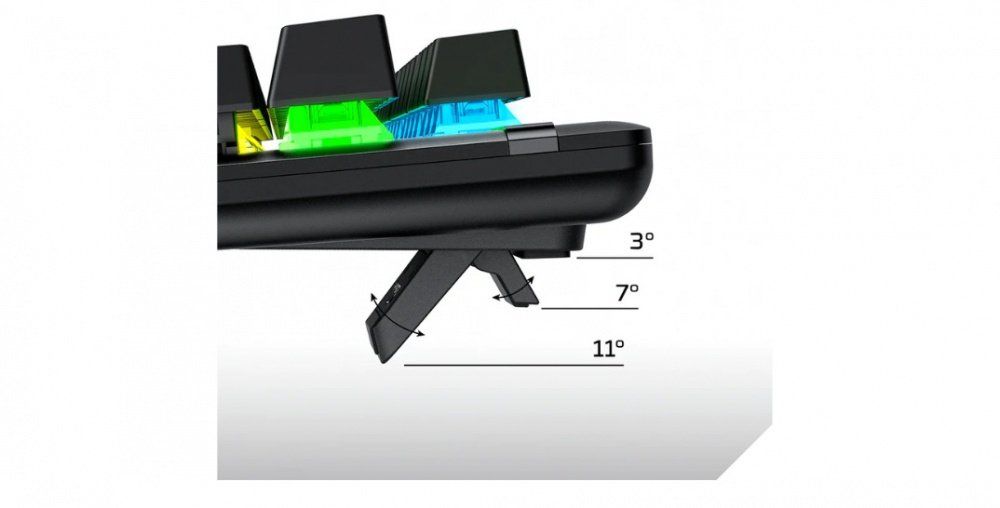 Adjust the two-step keyboard feet for three different angle settings (3°, 7°, or 11°), whichever makes your wrists the most comfortable.