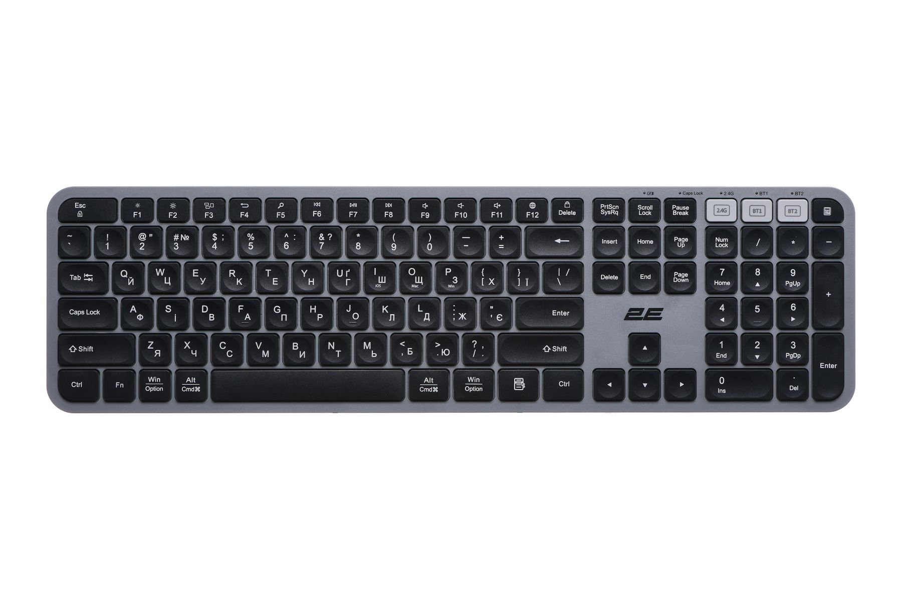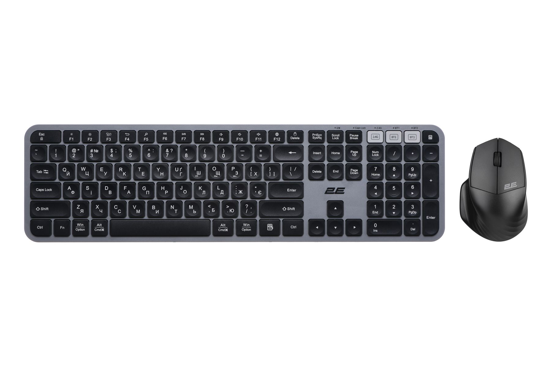 The presence of three connection modes for both the keyboard and the mouse - a USB adapter and two Bluetooth modes - makes it possible to connect the kit to three devices at the same time. Using the 2E kit has never been so convenient: just connect the PC/laptop or phone/tablet to the kit once, and you can effortlessly switch between devices by simply pressing three keys on the keyboard or selecting the appropriate mode on the mouse. Multimedia keys are also available. Their "purpose" can be changed based on the individual needs of the user.