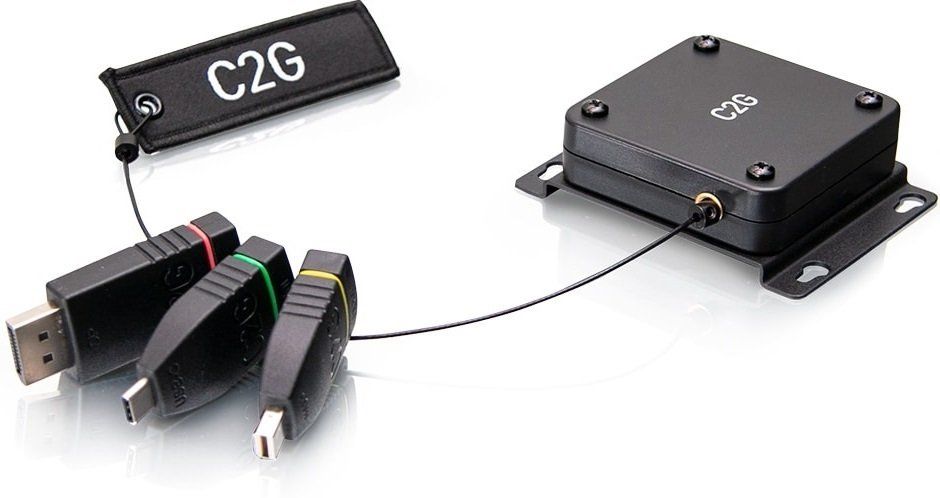 Adapters retractable C2G Adapter Ring HDMI to mini DP DP USB-C CG84269. The patented universal HDMI 4K adapter ring is the perfect addition to conference rooms, huddle rooms, lecture halls, or classrooms so everyone can connect. The standard configuration includes adapters to connect virtually any device to a display that supports video resolutions up to 4K. Standard configuration includes HDMI to DisplayPort, Mini DisplayPort, or USB-C adapters to resolve connectivity issues. Color coded adapters. Each adapter is color-coded with a stripe that saves time by making it easy to find the right adapter.