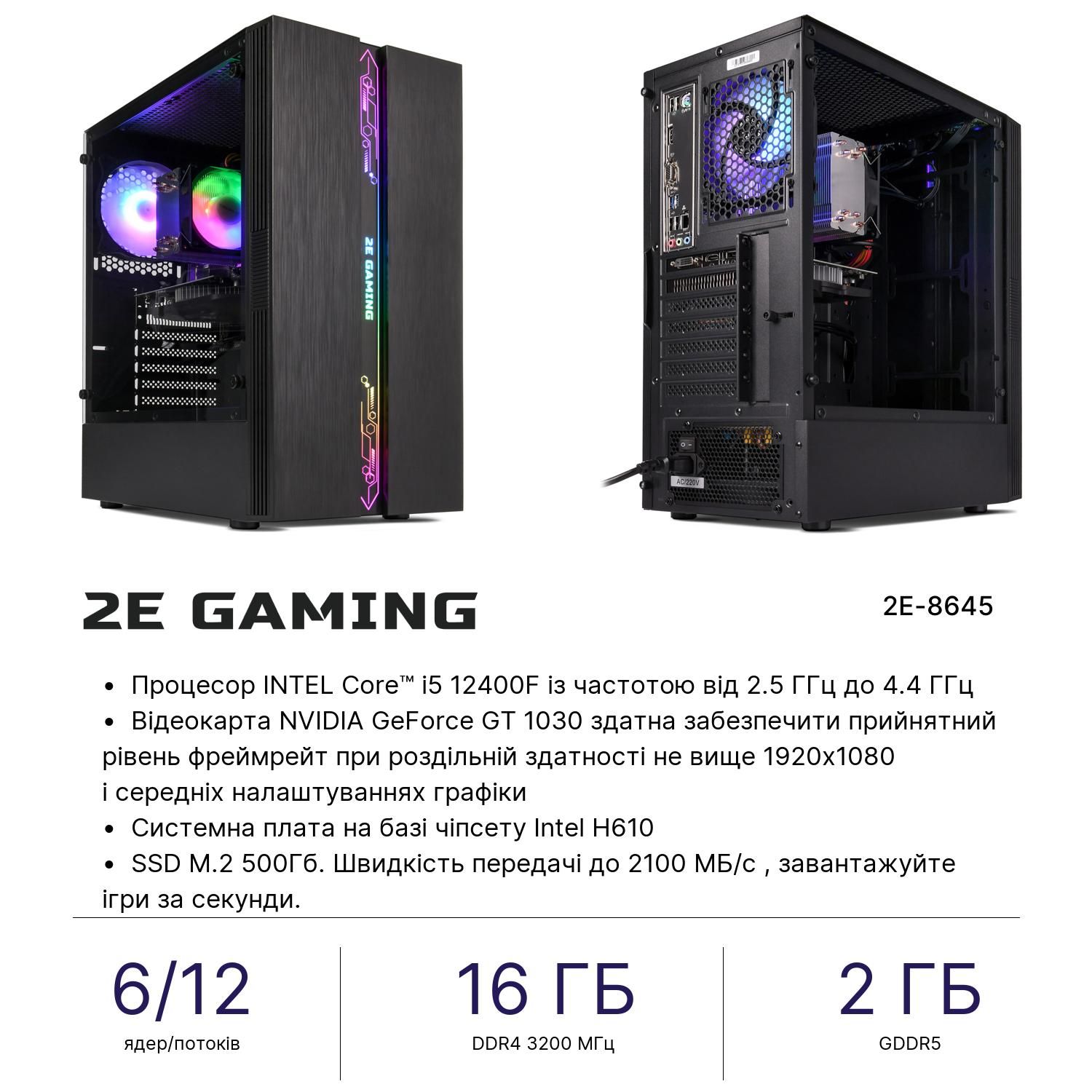 2E PC Complex Gaming Intel i5-12400F, 16Gb, F500GB, NVD1030-2, H610, G2107, 500W, FreeDos