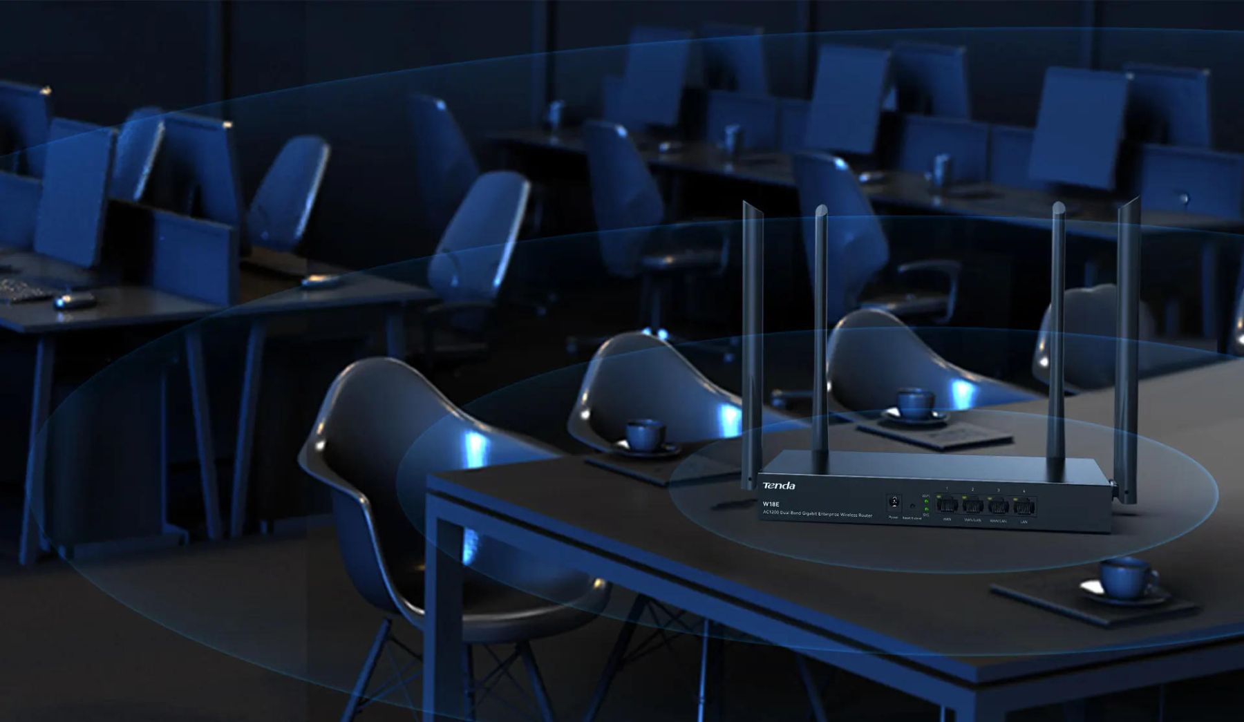 The TENDA W18E Hotspot AC1200 router delivers Wi-Fi speeds up to 1200 Mbps (2.4 GHz + 5 GHz), with 4 Gigabit ports and Captive Portal support for 50 accounts. It handles up to 80 users simultaneously, offering VPN, filtering, and bandwidth management features.