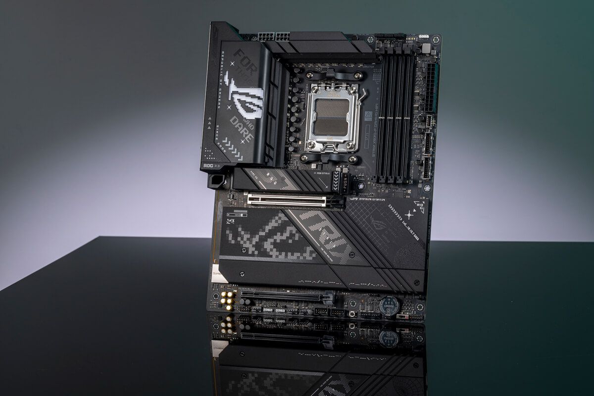 The ROG Strix X870-F is sleek and understated, empowering you to seamlessly combine it with a wide range of system components. Its deep black PCB and matching metallic heatsinks create a dark and intense look, while a touch of RGB lighting on the I/O shroud lets you either stay under the radar or make a bold statement.