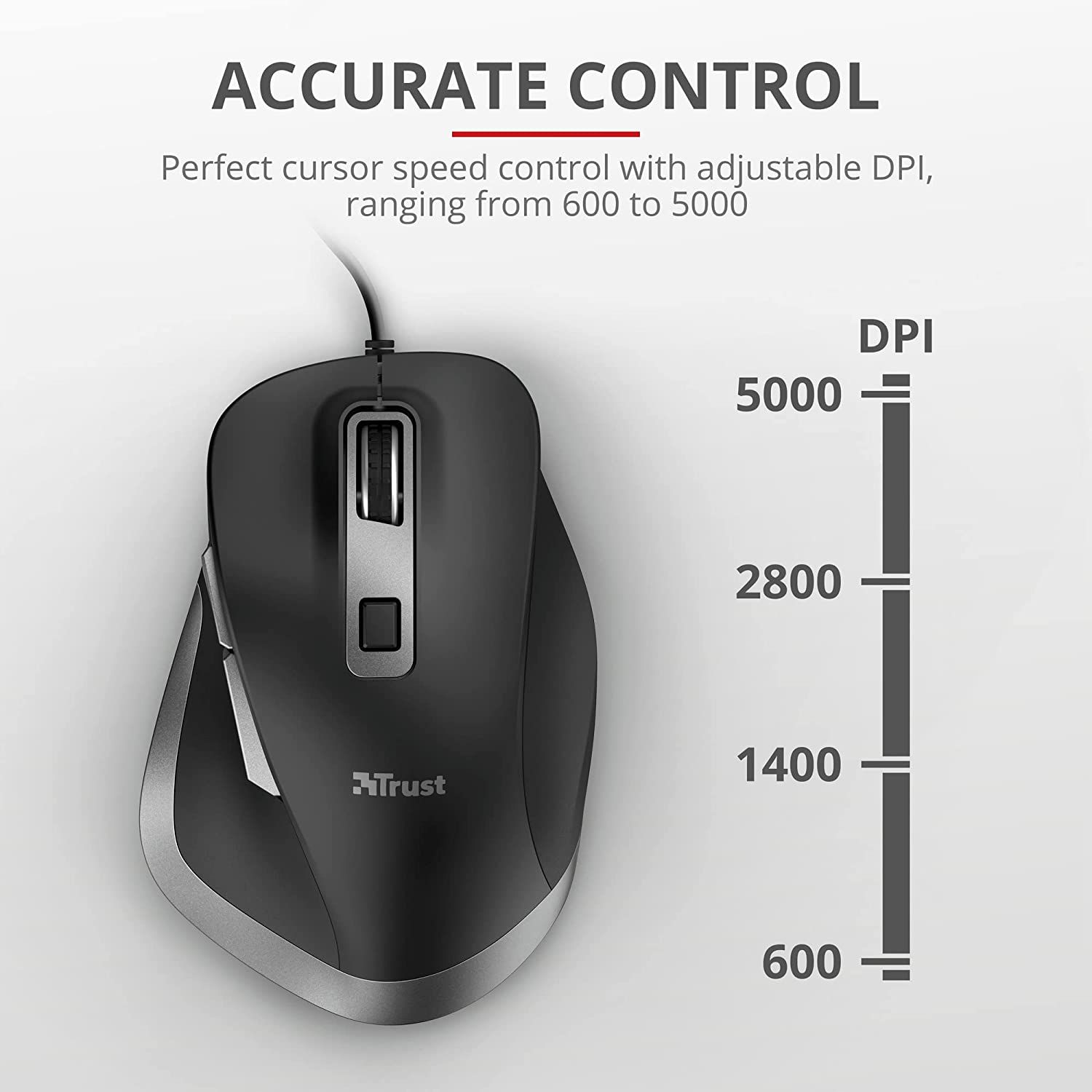 With 6 easily accessible buttons – for your fingers, thumbs, and to adjust DPI from 600 to 5000 – you’re always in complete control.