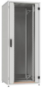 Telecommunications cabinet with glass doors. Supplied in disassembled form in three cardboard boxes. The frame, side panels, and doors are powder-coated in gray (RAL 7035) or black (RAL 9005). Mounting and horizontal profiles have an aluzinc (Al-Zn) coating.