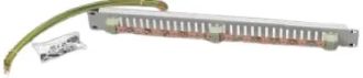 This is a rack-mounted grounding kit with 10 grounding points, a 400 mm long copper busbar, 4 4 mm diameter yellow-green grounding cables, and a 1U mounting plate that is compatible with 19″ cabinets.