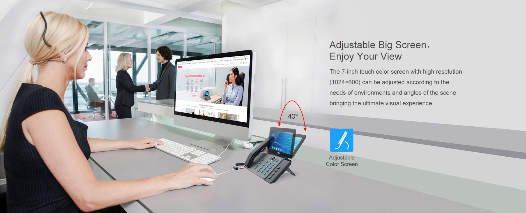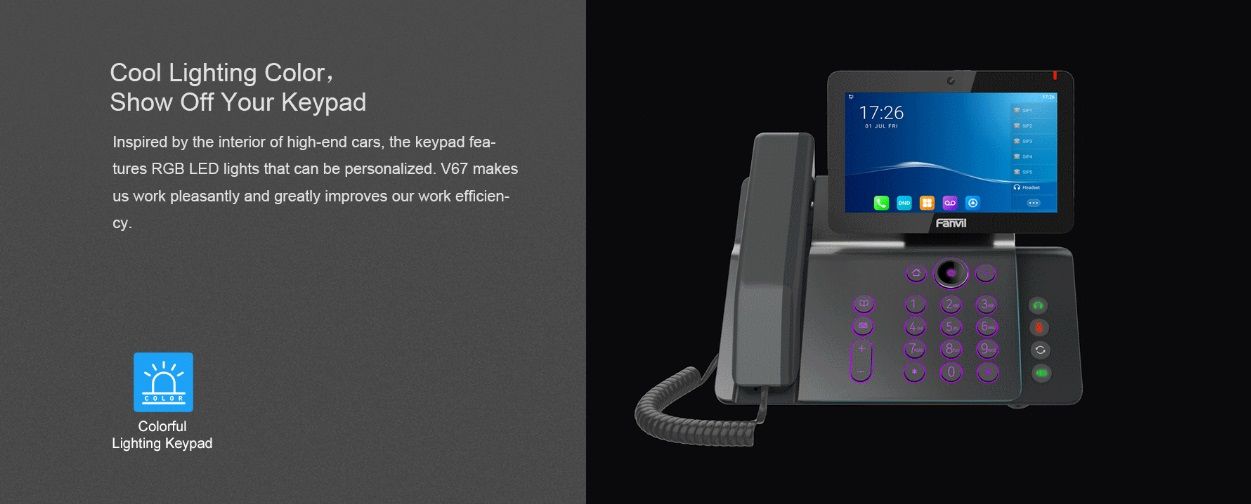 V67 is more than an efficient telephone but also a delicate work of art, which provides a more intelligent and elegant office operation experience for executives, managers and teleworkers. With brand new design, V67 features an adjustable touch screen and a keypad with colorful light effect that improve the beauty and comfort of office desktop.