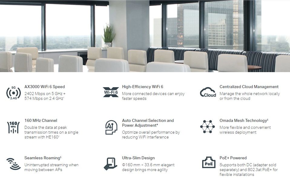 Features:Wall mountable, Ceiling mountable, Wireless speed limiting, QoS, Wireless statistics for SSID/access point/client, Wireless mode schedule, MU-MIMO, Reset button, 1024-QAM high data rate, HE160, Seamless roaming, Omada Mesh, Band control, Load balance