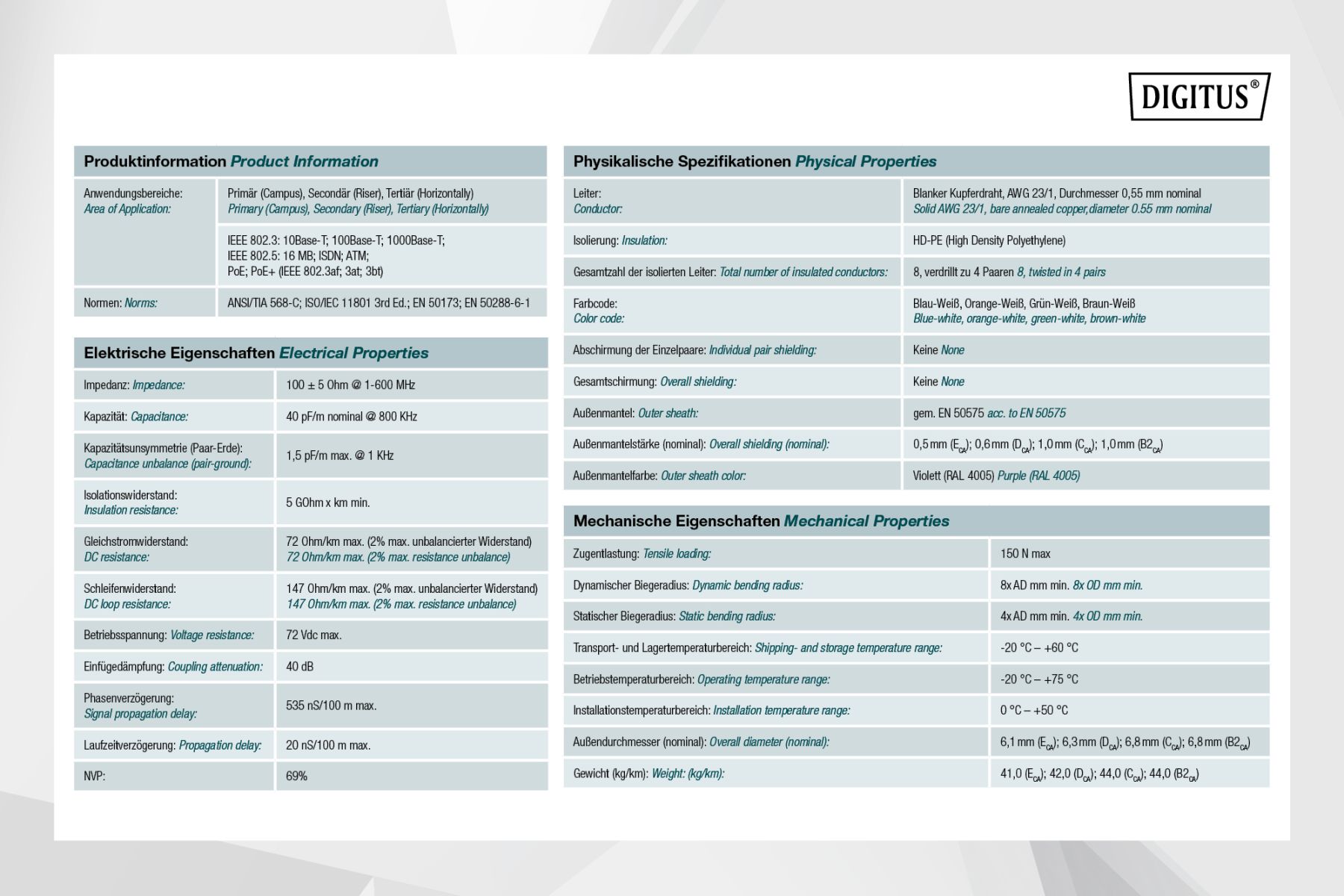 - FIRE PROTECTION: Data cable corresponds to CPR Euro Class BauPVO Eca in accordance with EN 50575 – LSZH halogen-free flame-retardant low smoke – With HD-PE polyethylene outer sheath (0.5 mm thickness) color purple (RAL 4005)