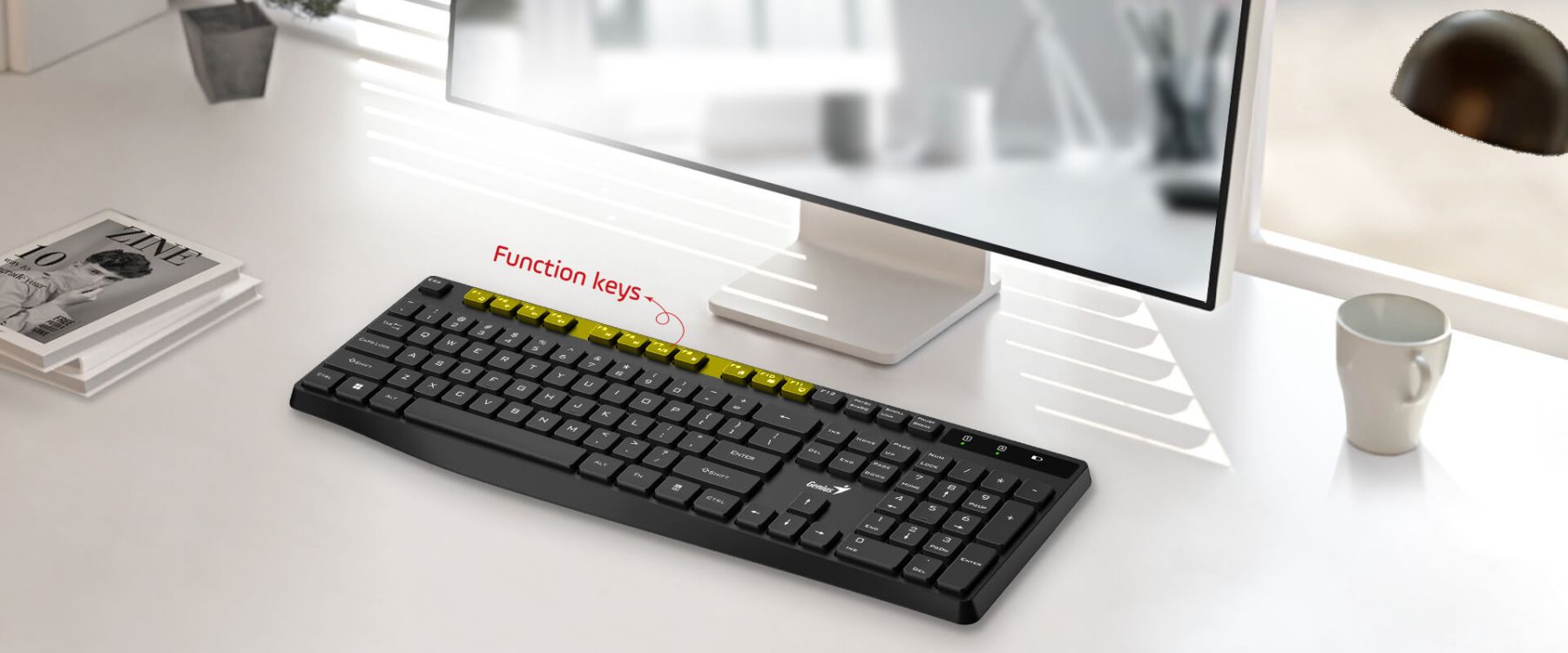 Компактний дизайн повнорозмірної клавіатури економить місце на робочому столі. Вона оснащена цифровим блоком, 11 мультимедійними клавішами, індикатором низького заряду акумулятора та зручною функцією plug-and-play, що не потребує інсталяції.