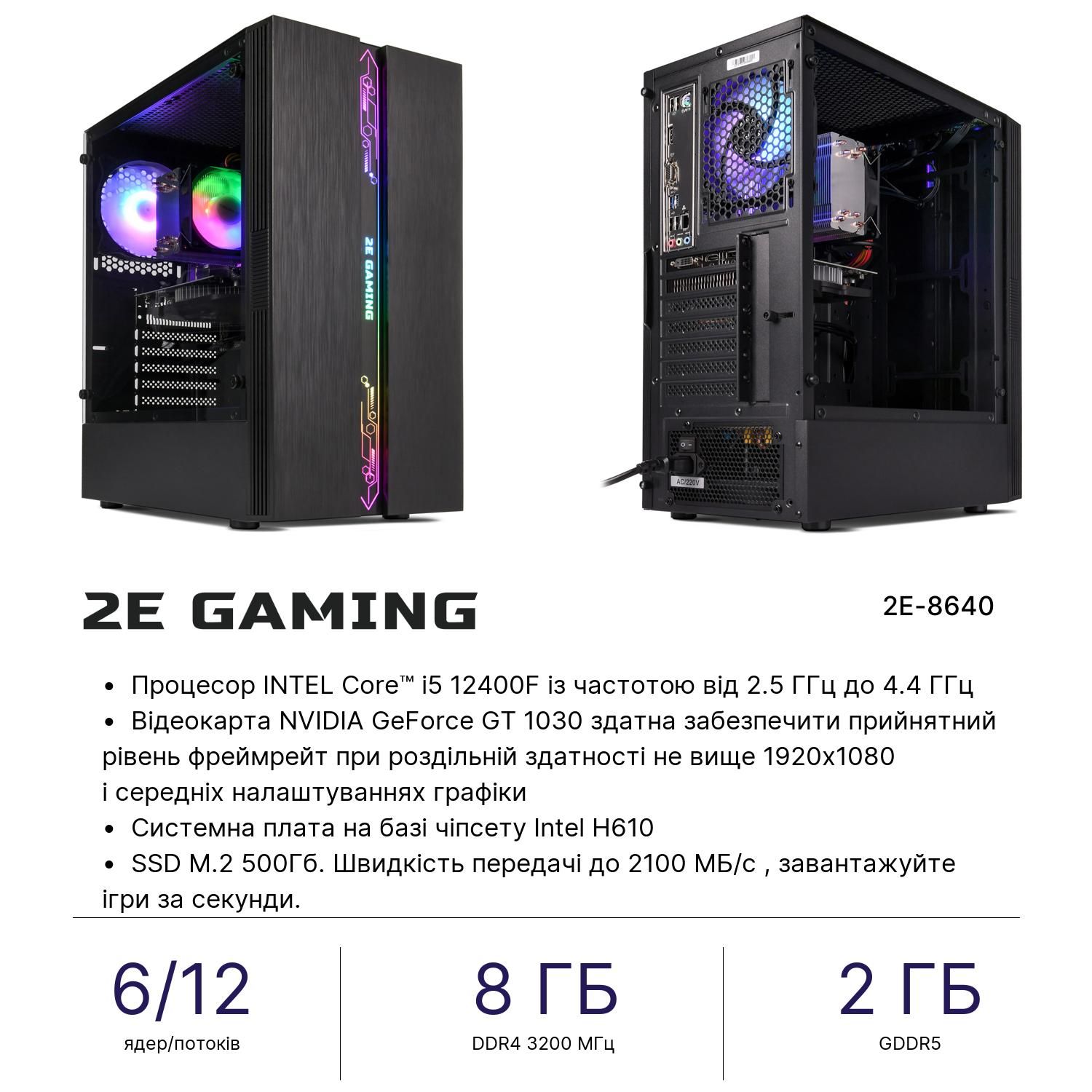 Комп’ютер персональний 2E Complex Gaming Intel i5-12400F, 8Gb, F500GB, NVD1030-2, H610, G2107, 500W, Win11