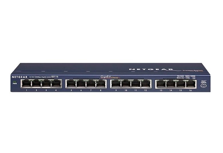 Некерований гігабітний комутатор NETGEAR GS116GE має 16 портів 10/100/1000 Мбіт/с, на кожному з яких є світлова індикація активності. Пропускна здатність комутатора становить 32 Гбіт/с. Технологія Green Ethernet зменшує енергоспоживання комутатора. Характерними особливостями цього комутатора є: пріоритети трафіку.