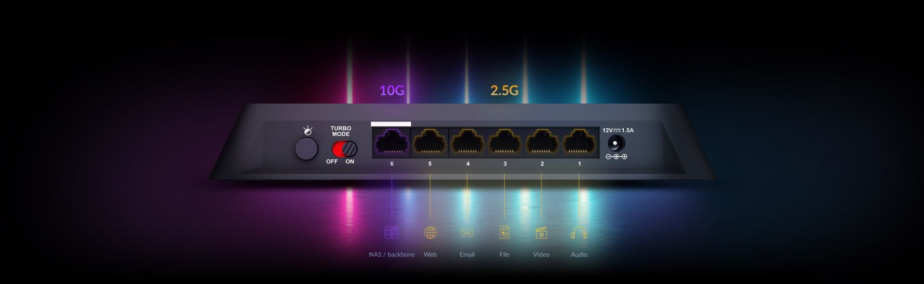 6-портовий мультигігабітний некерований комутатор. Насолоджуйтесь надшвидким 10-гігабітним висхідним каналом, п'ятьма 2,5-гігабітними портами, турбо-режимом для визначення пріоритетів QoS на основі портів і різнобарвним світлодіодним підсвічуванням, що дозволяє усунути вузькі місця в мережі та максимізувати продуктивність та пропускну здатність мережі. Він оснащений п'ятьма 2,5-гігабітними портами для максимальної пропускної здатності та продуктивності – ідеально підходить для необмеженого використання пристроїв Wi-Fi 6, високопродуктивних ігрових комп'ютерів та робочих станцій.