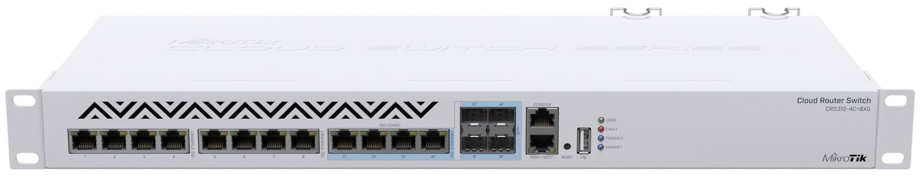 CRS312-4C+8XG-RM має подвійне джерело живлення для резервування - без несподіваних простоїв, коли наближаються терміни заміни. Світч отримав повнорозмірний USB, консольний порт для конфігурації та корпус для монтажу в стійку 1U - підходить для всіх стандартних стійок.