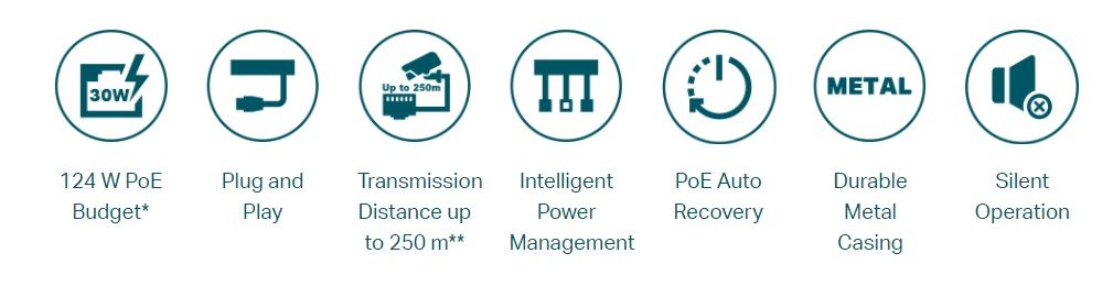 При перевищенні загальної потужності 124 Вт розумний розподіл живлення відключить живлення портів з низьким пріоритетом, щоб забезпечити живлення портів з високим пріоритетом та захистити пристрій від перевантаження. Також є автоматичне виявлення та подача необхідного живлення на PoE-пристрої із захистом від пошкоджень обладнання з PoE та без PoE.