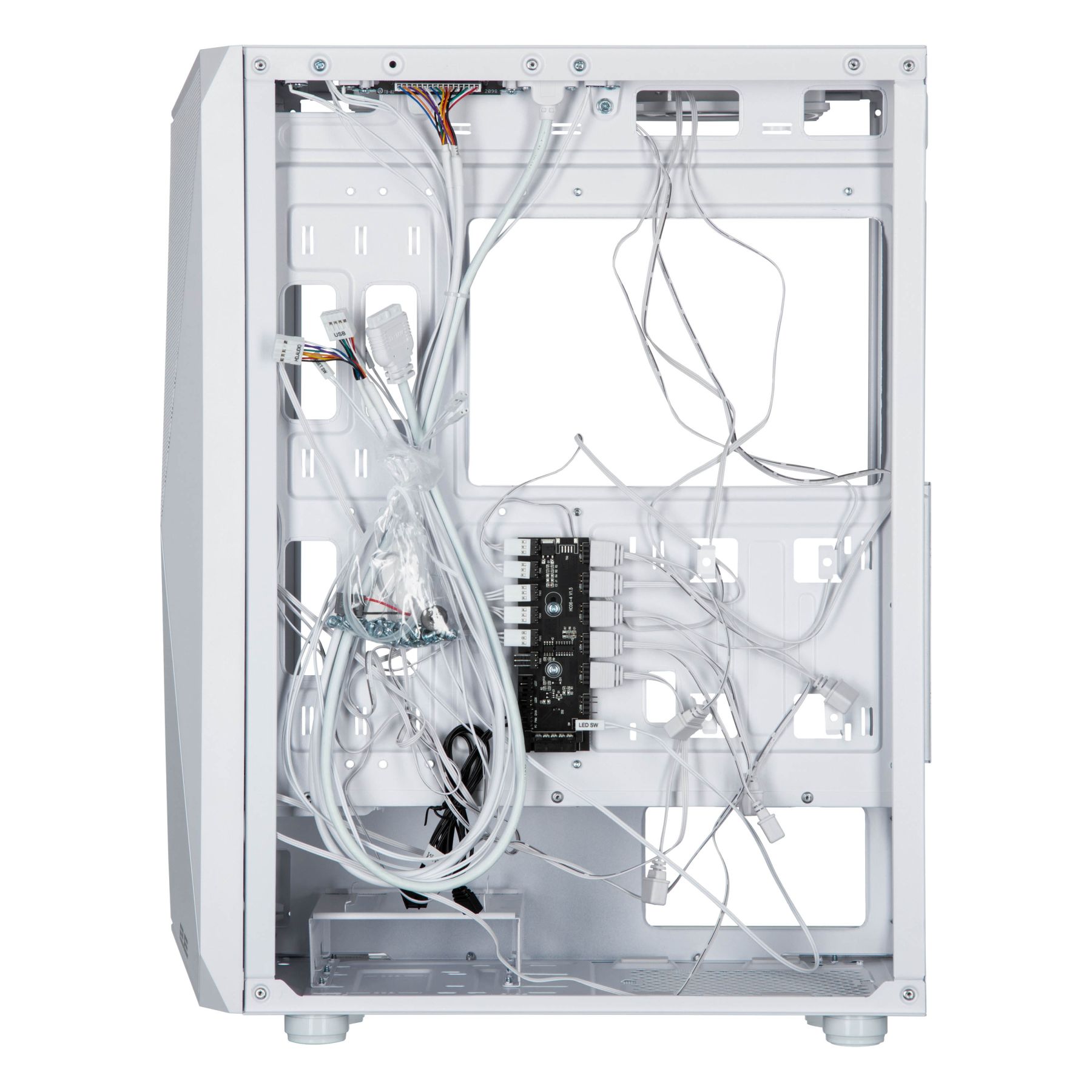 Для підключення, управління та контролю за комп'ютерною периферією та підсвічуванням, в арсеналі корпусу присутні роз'єми 1xUSB3.0, 2xUSB2.0, HD AUDIO+MIC, кнопки та індикатори Power, Reset, LED, HDD LED. В комплекті 5 х 120мм ARGB вентилятори, що підключені до концентратору.