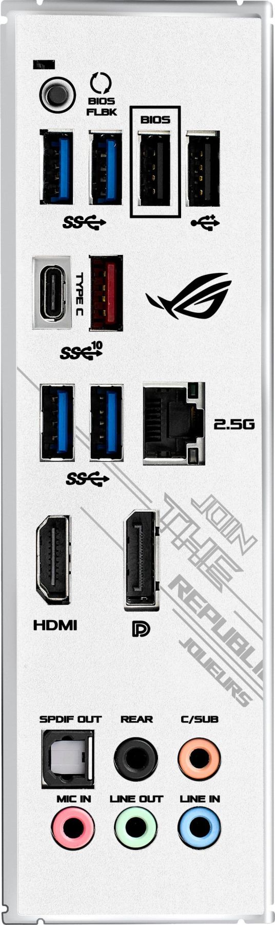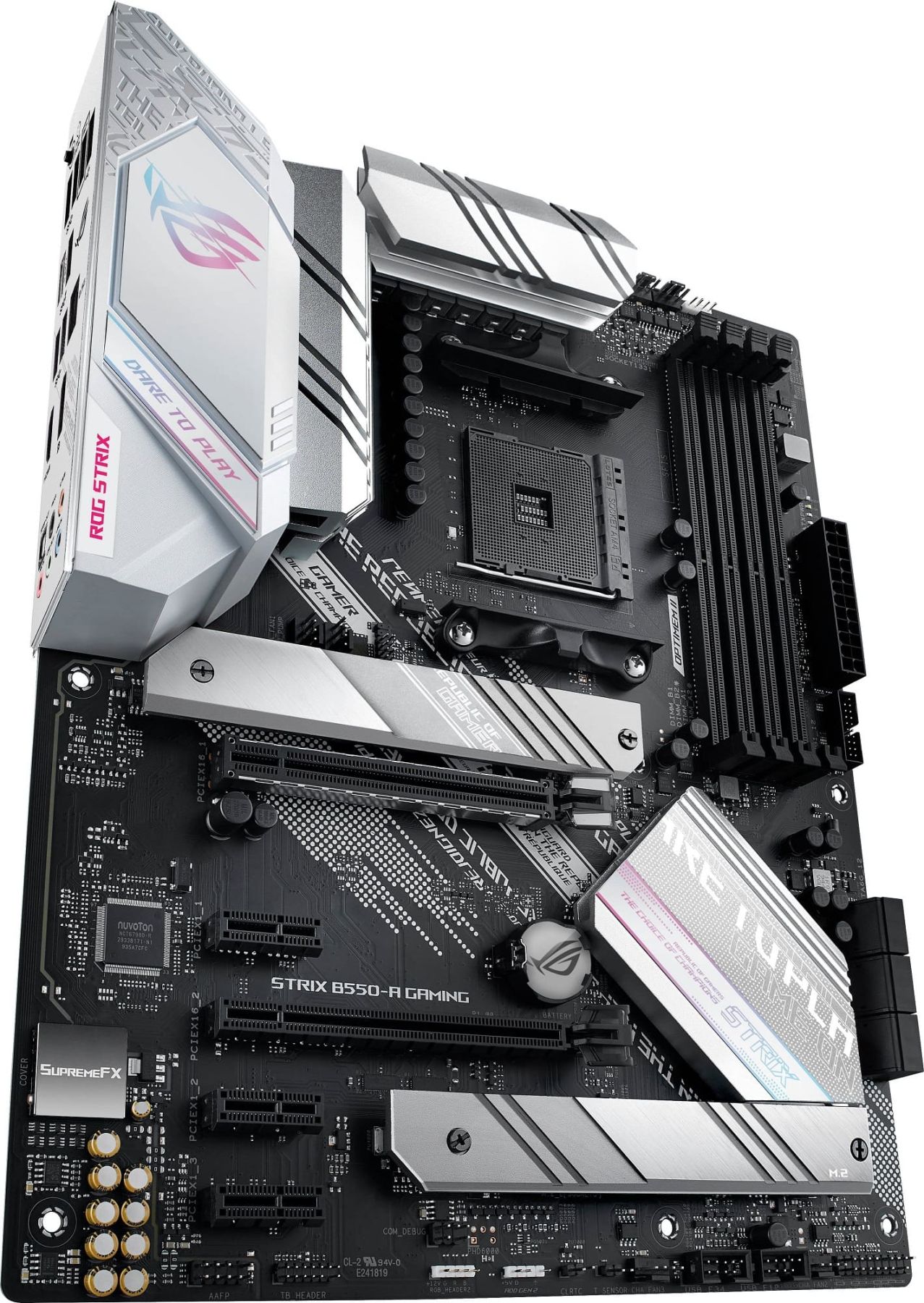Футуристичне кібертекстове оформлення кожуха інтерфейсних роз'ємів з оновленим логотипом ROG додає моделі ROG Strix B550-A Gaming привабливий зовнішній вигляд, що відображає її геймерський характер. Унікальність цій моделі надає оформлення у сліпучих сріблясто-білих тонах.