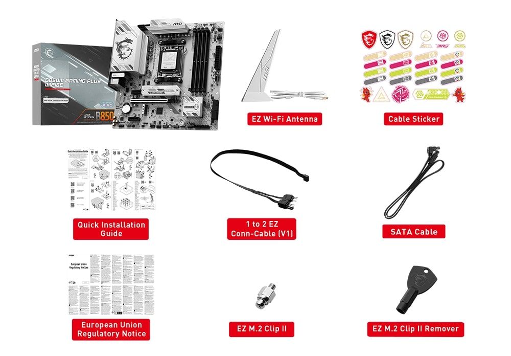 Комплектація:SATA Cable, User Manual, Quick guide, Wi-Fi Antenna, EZ M.2 Clips, EZ M.2 Clip Remover, 1 to 2 EZ Conn-Cable, Cable Stickers
