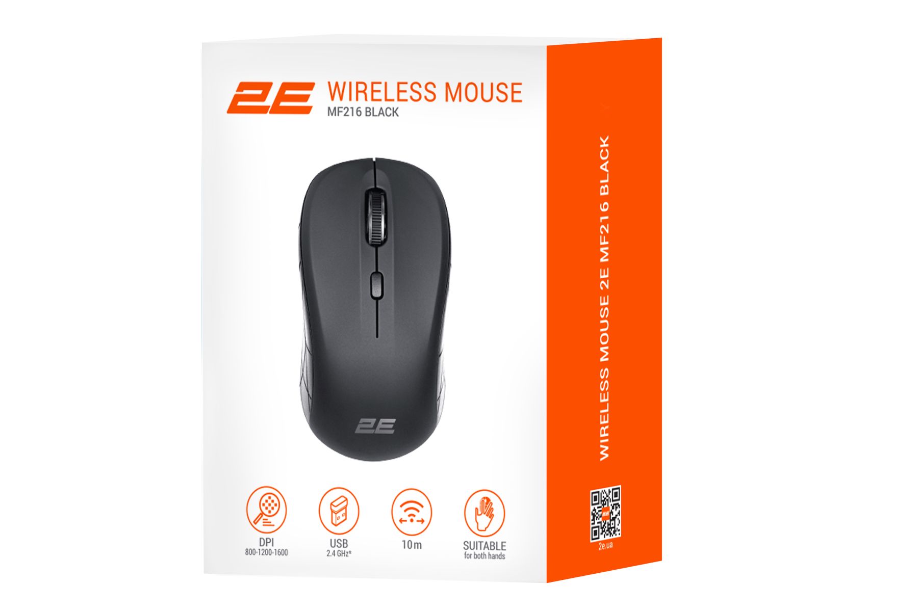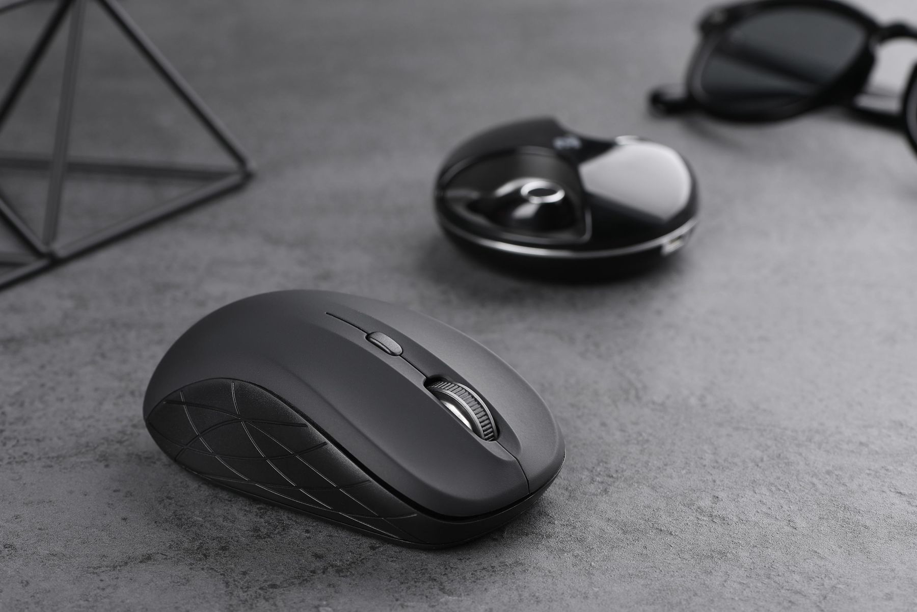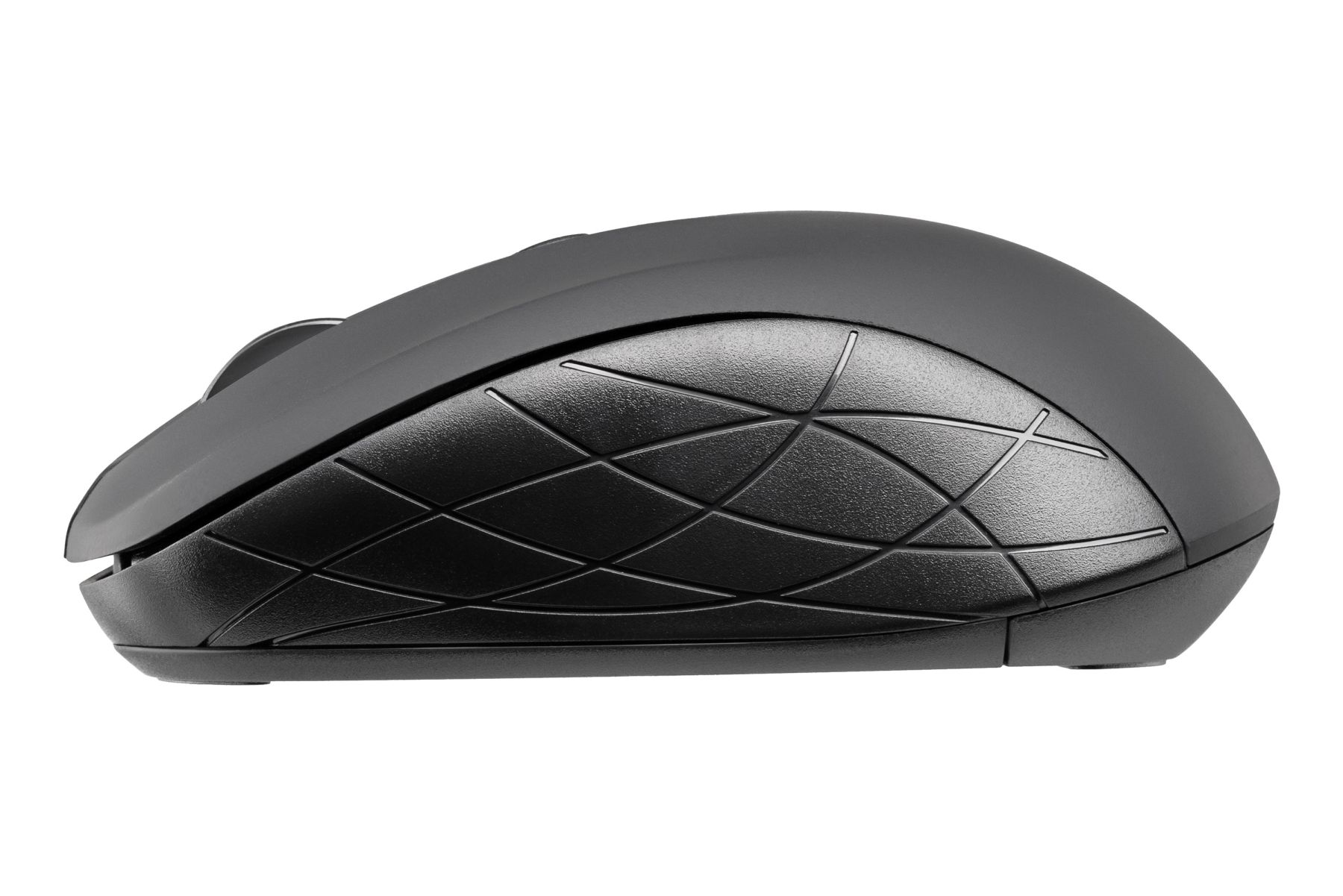 Бездротова ергономічна миша з матового пластика забезпечить комфортну роботу протягом тривалого часу. Виконана в класичному дизайні в чорному кольорі і з геометричними вставками на бічних сторонах миші. Швидкість курсора налаштовується під власні вимоги: 800, 1200 або 1600 DPI.