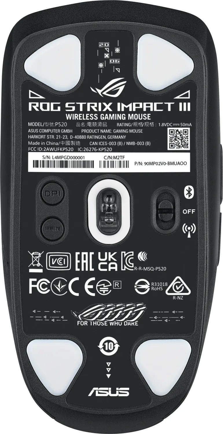 Перемикачі, що використовуються в ROG Strix Impact III Wireless, мають ресурс у 70 мільйонів натискань. Щоб мінімізувати відхилення сили спрацьовування лівої та правої кнопок миші, підбираються пари перемикачів із відхиленням сили у діапазоні +/-5 г, що забезпечує стабільне відчуття натискання.