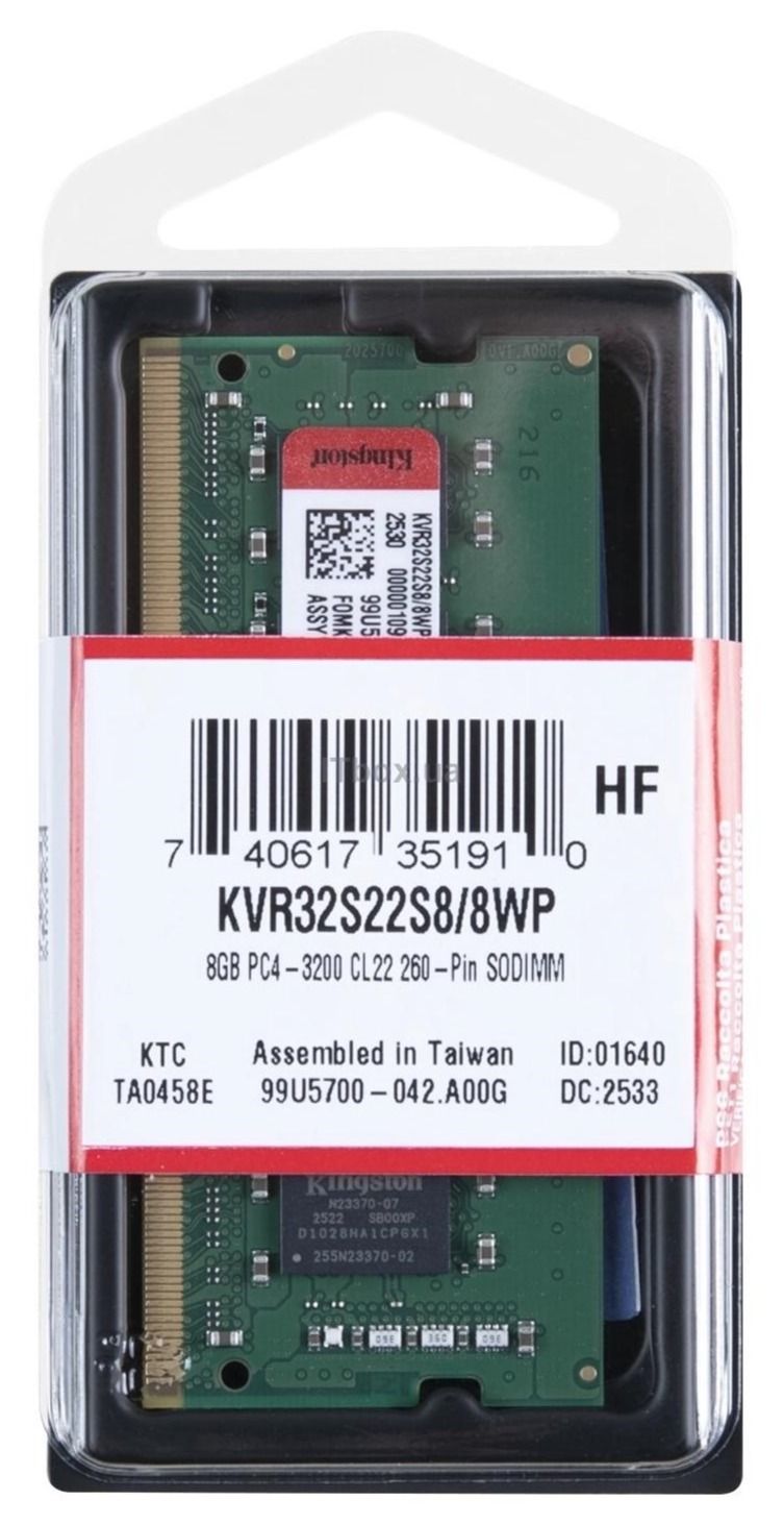 Модуль Kingston DDR4 8 ГБ виконаний у форм-факторі SO-DIMM із 260 контактами для сумісності з сучасними ноутбуками. Однобічна структура з вісьмома мікросхемами FBGA сприяє стабільній роботі та швидкому відгуку системи. Невелика висота 30 мм полегшує встановлення навіть у тонких корпусах ноутбуків.