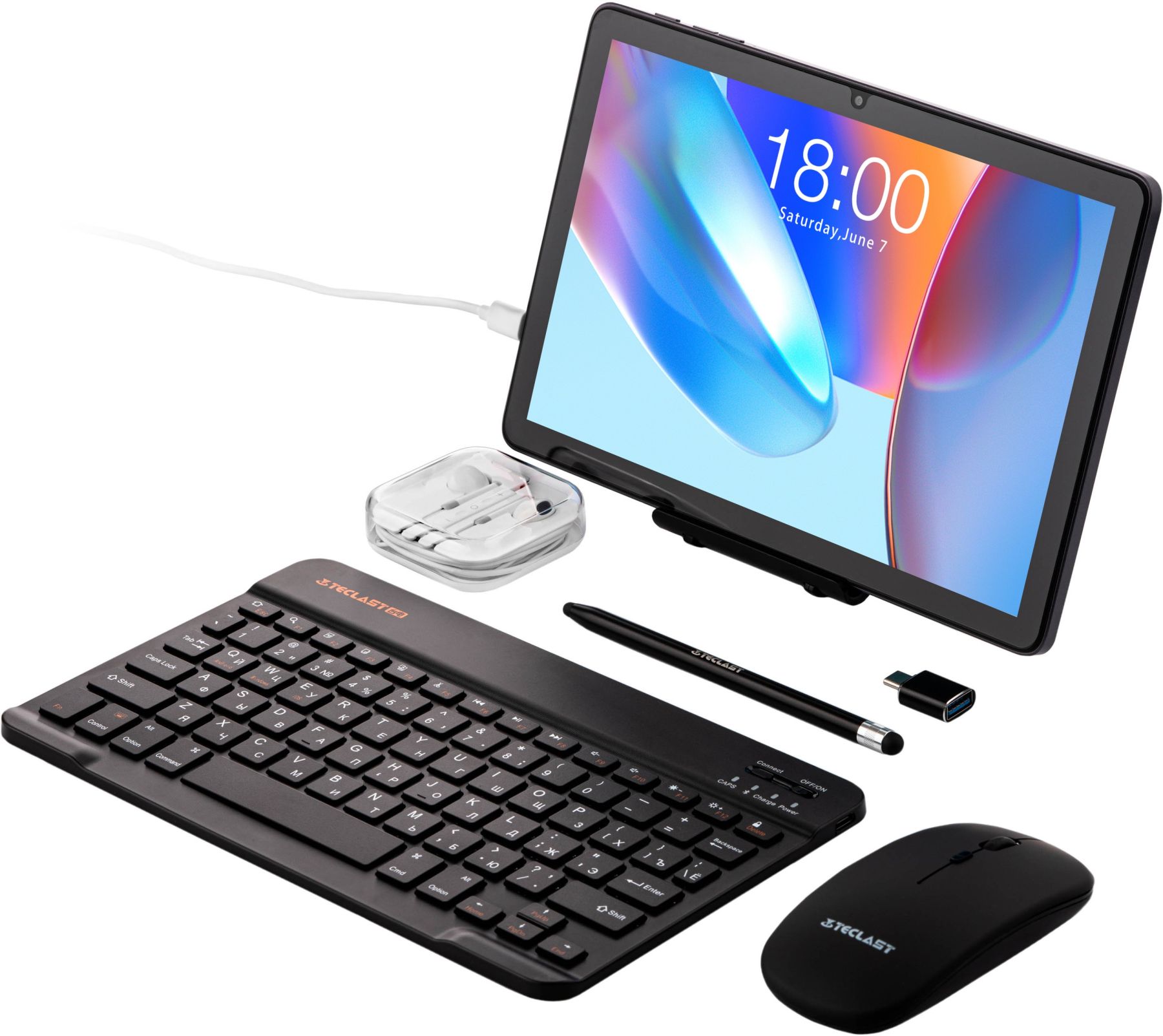 Комплектація:зарядний пристрій, гарантійний талон, планшет, інструкція, кабель USB – Type-C, захисна плівка, навушники, пасивний стилус, миша Bluetooth, підставка під планшет, клавіатура Bluetooth, скріпка SIM-слота, чохол книжка, захисна накладка