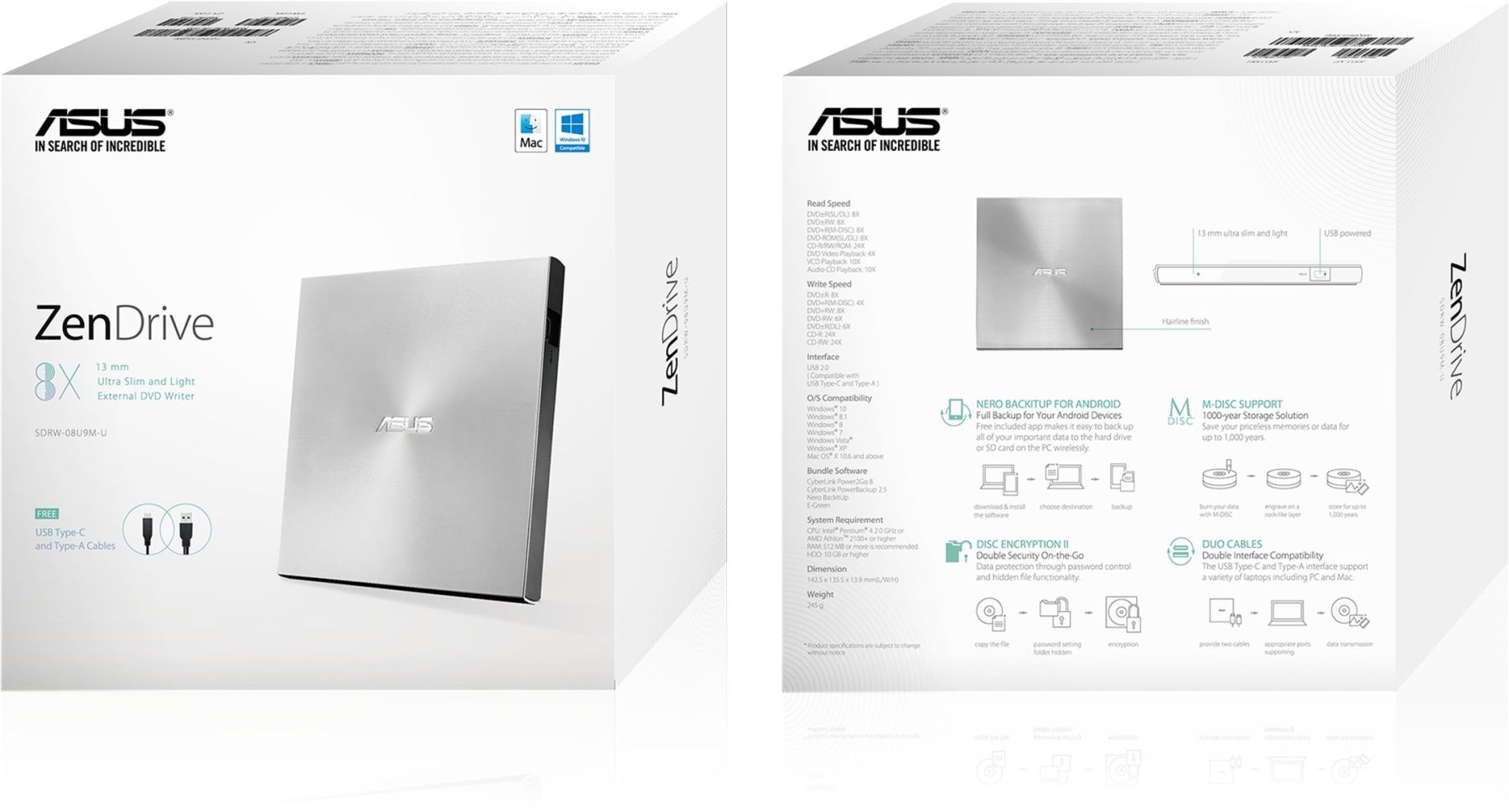 ASUS ZenDrive U9M поєднує функціональність і мінімалістичний дизайн з ультратонким корпусом товщиною 13 мм та дизайном у стилі Zen з обробкою у вигляді концентричних кіл, що додає елегантності будь-якому комп'ютерному набору. Простота дизайну робить його ідеальним супутником для тонких і легких ноутбуків.