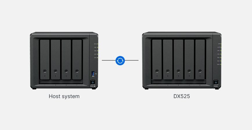 Додаткові відсіки DX525, керовані через DiskStation Manager (DSM) хост-NAS, стають доступними одразу після підключення. Розширення томів «на льоту» забезпечує безперебійну роботу та розширення сховища на хості.