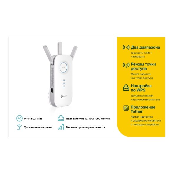 RE450 має підтримку стандарту Wi-Fi 802.11ac, що утричі швидший за стандарт 802.11n. RE450 надає високу швидкість дводіапазонного Wi-Fi до 1750 Мбіт/с, забезпечуючи надійне з'єднання для ресурсомістких завдань, як-от перегляд 4K/HD-відео, онлайн-ігор без затримок і завантаження файлів великого розміру.