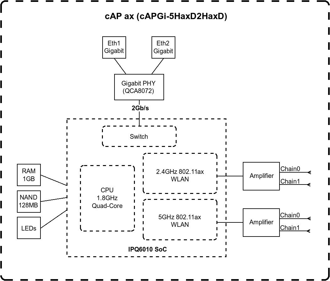 cAP ax оснащена сучасним чотирьохядерним процесором з тактовою частотою 1,8 ГГц, накопичувачем NAND і гігабайтом оперативної пам'яті. Достатньо для того, щоб використати весь потенціал найпотужнішого мережевого програмного забезпечення на ринку - RouterOS v7! Складні правила брандмауера, апаратне шифрування IPsec, Wireguard, BGP, розширена маршрутизація або кілька VPN-тунелів для віддаленої роботи - cAP ax може все це!