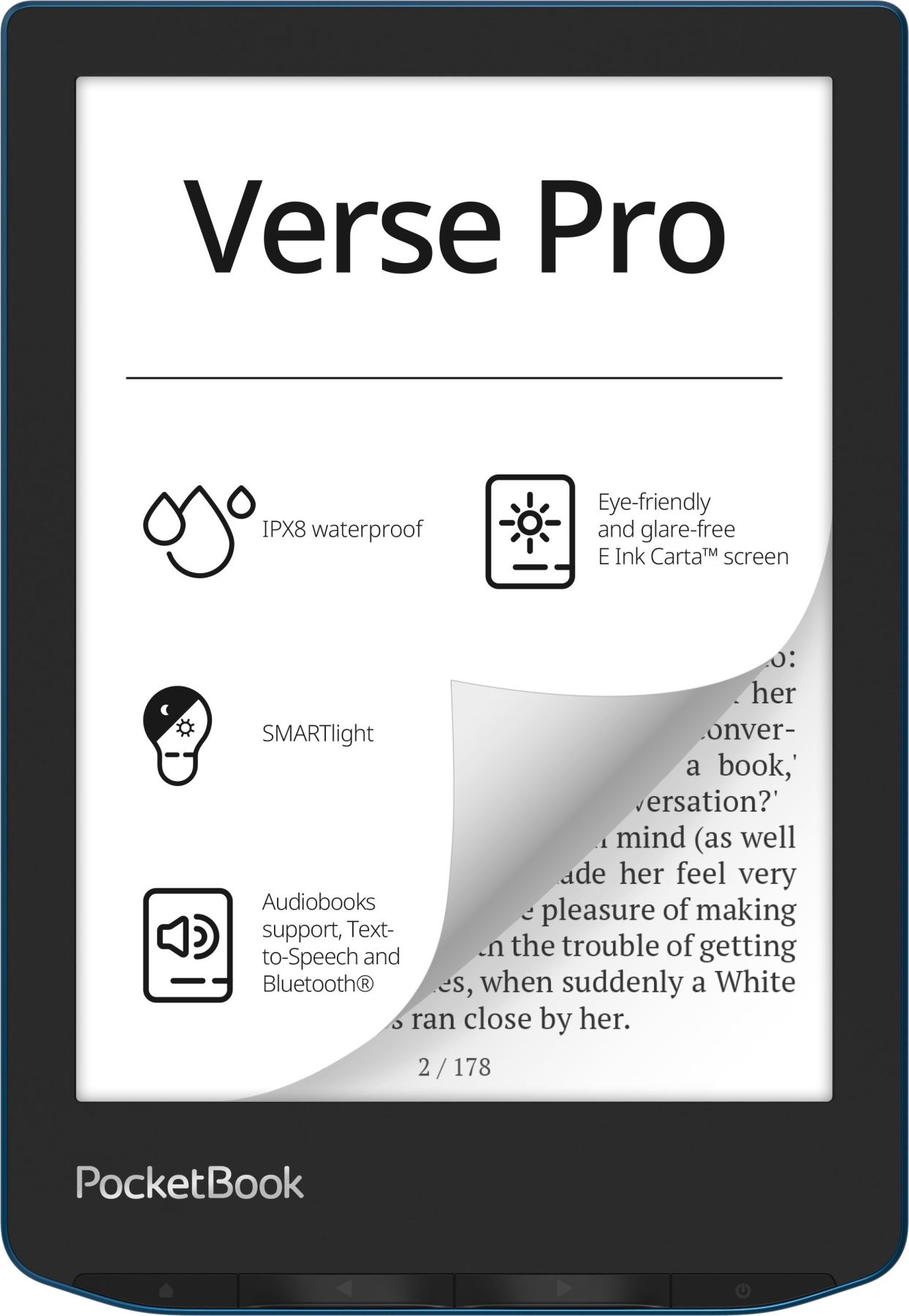 Созданный таким образом, чтобы выдерживать вредное воздействие воды, PocketBook Verse Pro соответствует стандарту IPX8. Это означает, что ридер можно погружать в пресную воду на глубину до 2 метров на срок до 60 минут без каких-либо вредных последствий. Независимо от того, читаете ли вы в ванне или у бассейна, вы можете погрузиться в свою любимую книгу, не беспокоясь о воздействии воды на устройство.