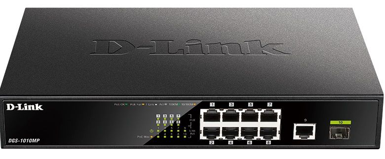 Комутатор D-Link DGS-1010MP, оснащений 9 портами 10/100 / 1000Base-T (8 портів підтримують Power over Ethernet (PoE)) і портом 1000Base-X SFP, призначений для малого бізнесу і дозволяє підключати і подавати живлення по Ethernet-кабелів на такі пристрої, як PoE-сумісні бездротові точки доступу, мережеві камери або IP-телефони. Даний комутатор оснащений пасивною системою охолодження, яка забезпечує безшумну роботу пристрою, що дозволяє помістити його практично в будь-якій кімнаті або офісі.