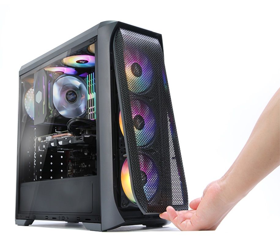 Передняя панель – металлическая сетка, для активной вентиляции, через которую просматривается свечение установленных вентиляторов. Специальный нажимный механизм внизу панели позволяет легко ее демонтировать, для того чтобы получить доступ к вентиляторам.
