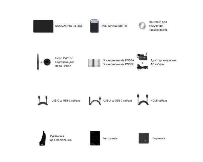 Package contents:stylus, USB-C cable, instruction, USB cable, replaceable tips for stylus, stylus stand, HDMI cable, glove, clip for removing tips, screen wipe, power cable, power supply, cleaning cloth, graphical monitor, keyboard