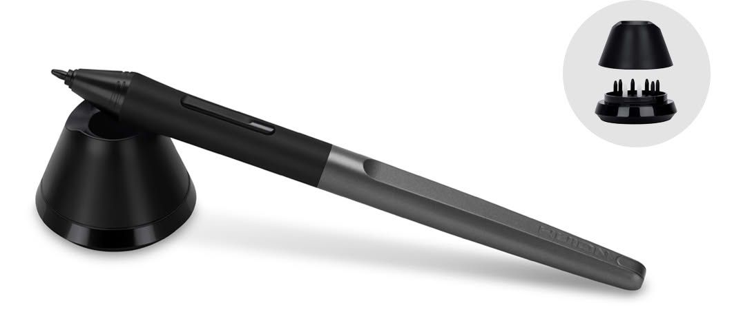 Package contents:tablet, instruction, stylus stand, Micro USB cable, 8 replaceable nibs (inside pen holder), OTG adapter (USB-C), passive pen/stylus