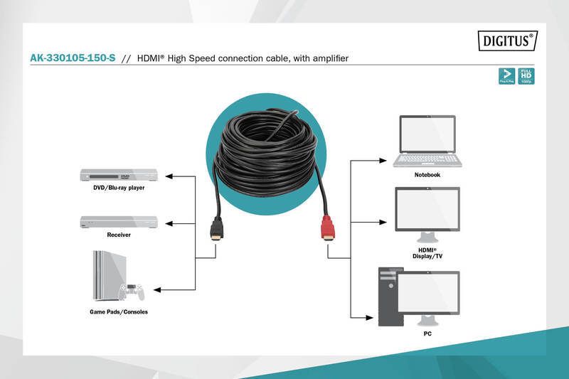DIGITUS Cable HDMI (M/M), 15m, High speed/Ethernet, active, black