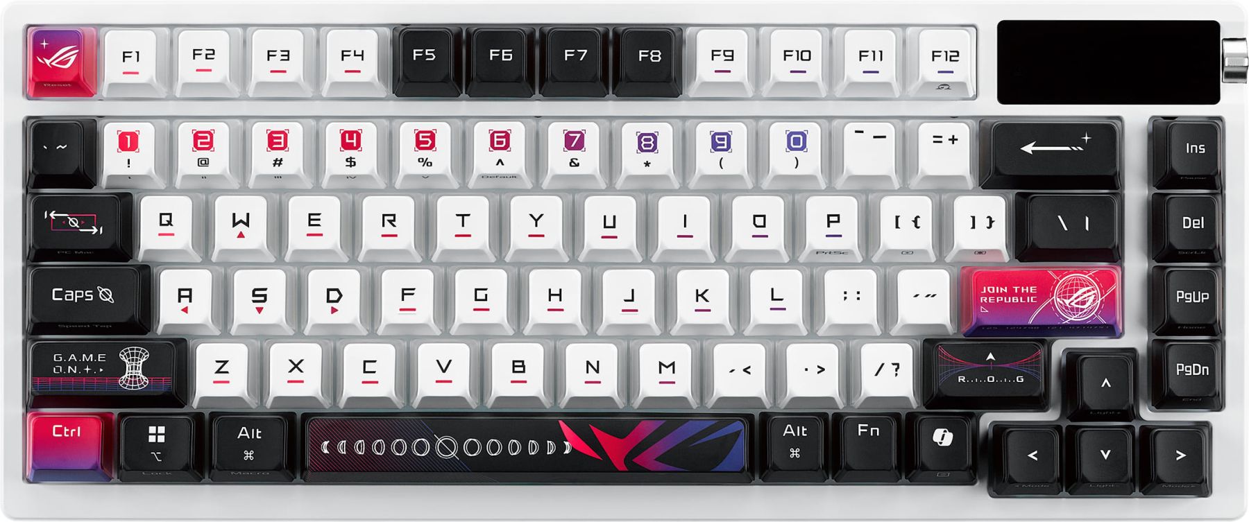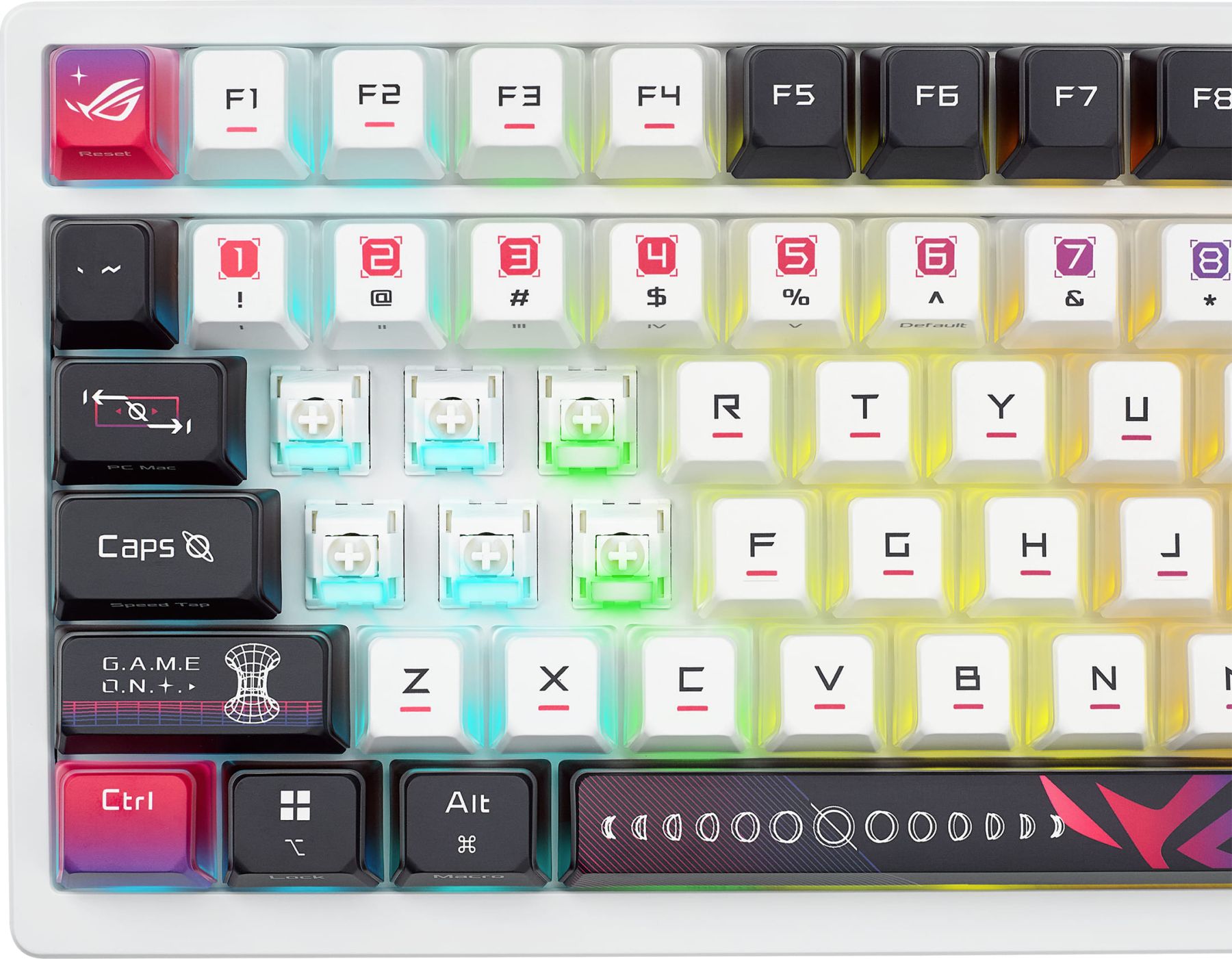 Stylish and functional, the keycaps on Azoth X feature a three-sided semi-translucent design that amplifies RGB shine-through for a stunning visual display. The front and top of each keycap is dye-sublimated with the ROG Stellar theme, giving it a signature look while ensuring legends stay sharp and vibrant even after countless gaming sessions.