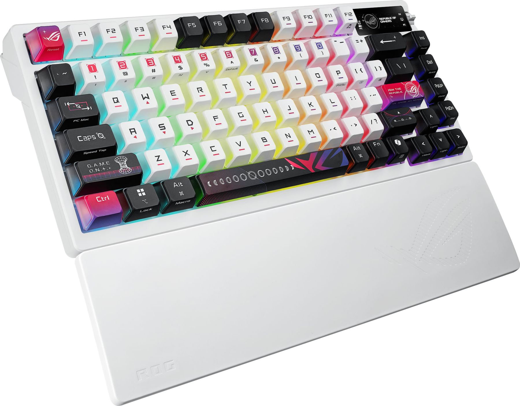 The Azoth X boasts an OLED display with intuitive controls, tri-mode connectivity including 2.4GHz ROG SpeedNova technology, a silicone wrist rest, three tilt angles, and Mac support.