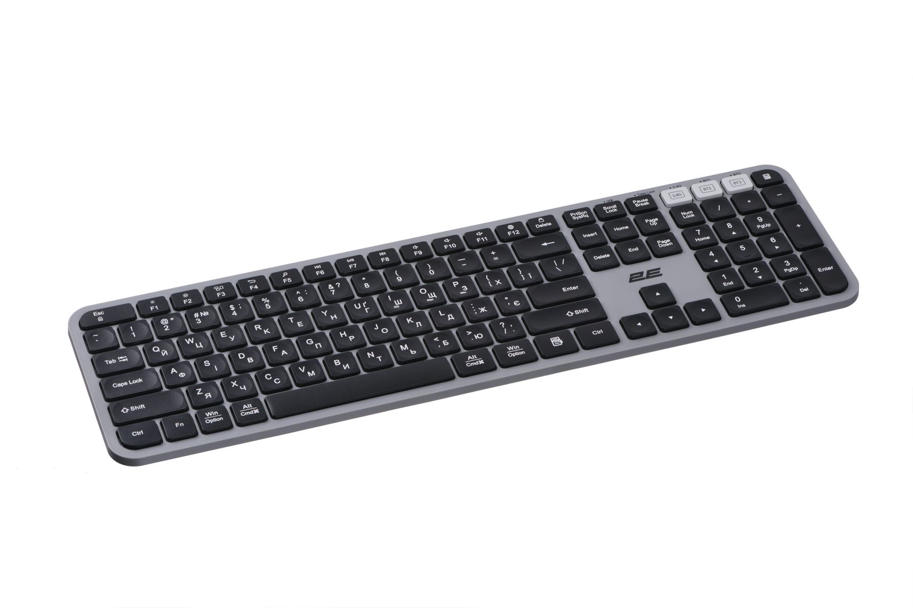 The presence of three connection modes for both the keyboard and the mouse - a USB adapter and two Bluetooth modes - makes it possible to connect the kit to three devices at the same time. Using the 2E kit has never been so convenient: just connect the PC/laptop or phone/tablet to the kit once, and you can effortlessly switch between devices by simply pressing three keys on the keyboard or selecting the appropriate mode on the mouse. Multimedia keys are also available. Their "purpose" can be changed based on the individual needs of the user.