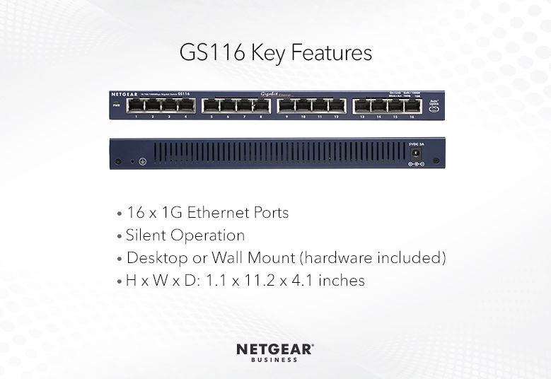 Get networks up and running with NETGEAR 16 Port Plug-and-Play unmanaged GS116GE switch. Set it and forget it, energy-efficient switches are built like tanks and last for decades.