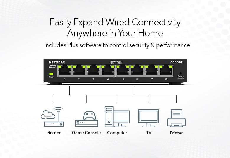 The NETGEAR 8-Port Gigabit Ethernet Plus Switch provides exceptional value to businesses looking to increase network visibility and control while enjoying plug-and-play connectivity.