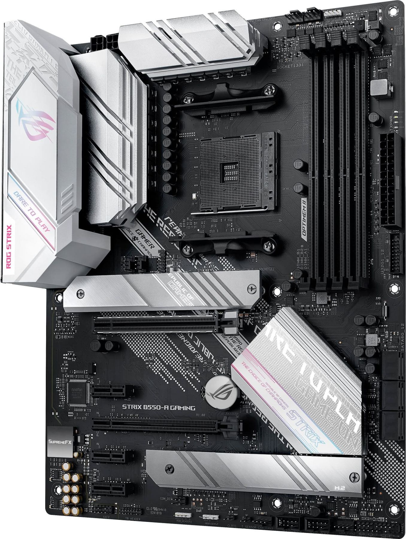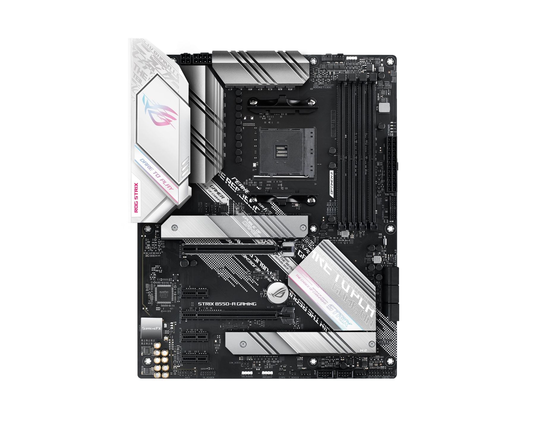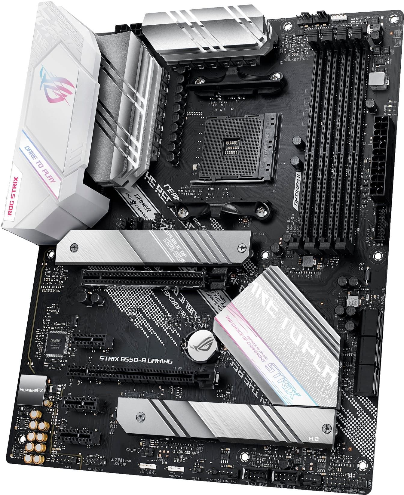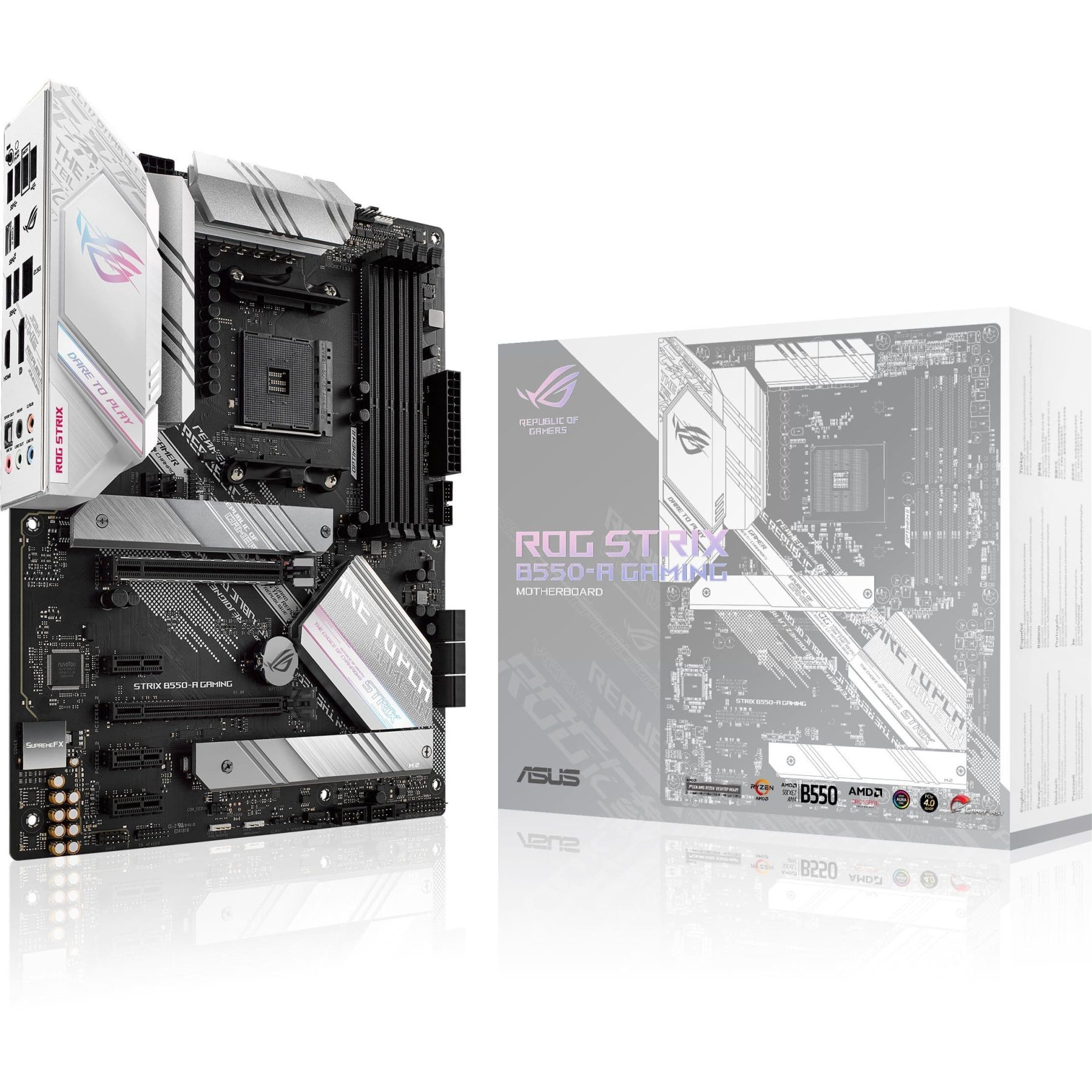 Finished in stunning white and silver, and featuring the redesigned ROG logo and recessed cybertext markings on its I/O shroud, ROG Strix B550-A Gaming is an eye-catcher. These new design touches move ROG Strix boldly towards the future, while clearly reflecting its gaming roots.