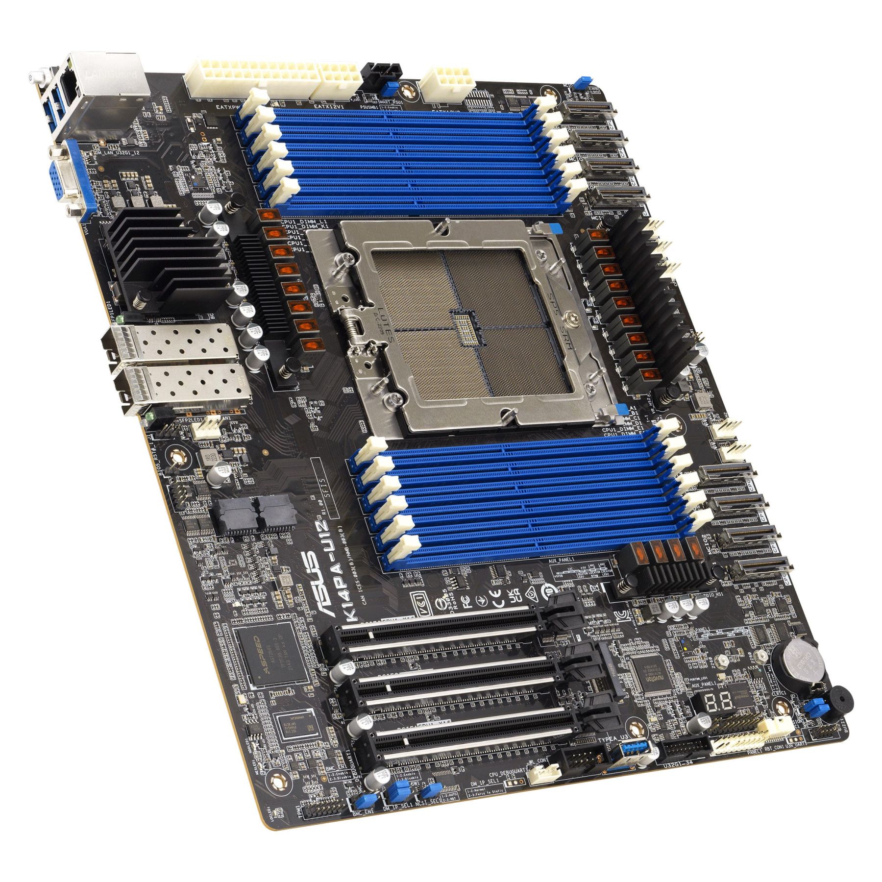 The K14PA-U12 also boasts eight MCIO slots, with MCIO7/MCIO8 supporting both NVMe and SATA devices. This design offers versatile storage options, allowing users to choose between NVMe and SATA drives to meet a variety of storage needs. Additionally, it ensures high performance with support for NVMe drives, making it ideal for data-intensive applications like databases and content creation.