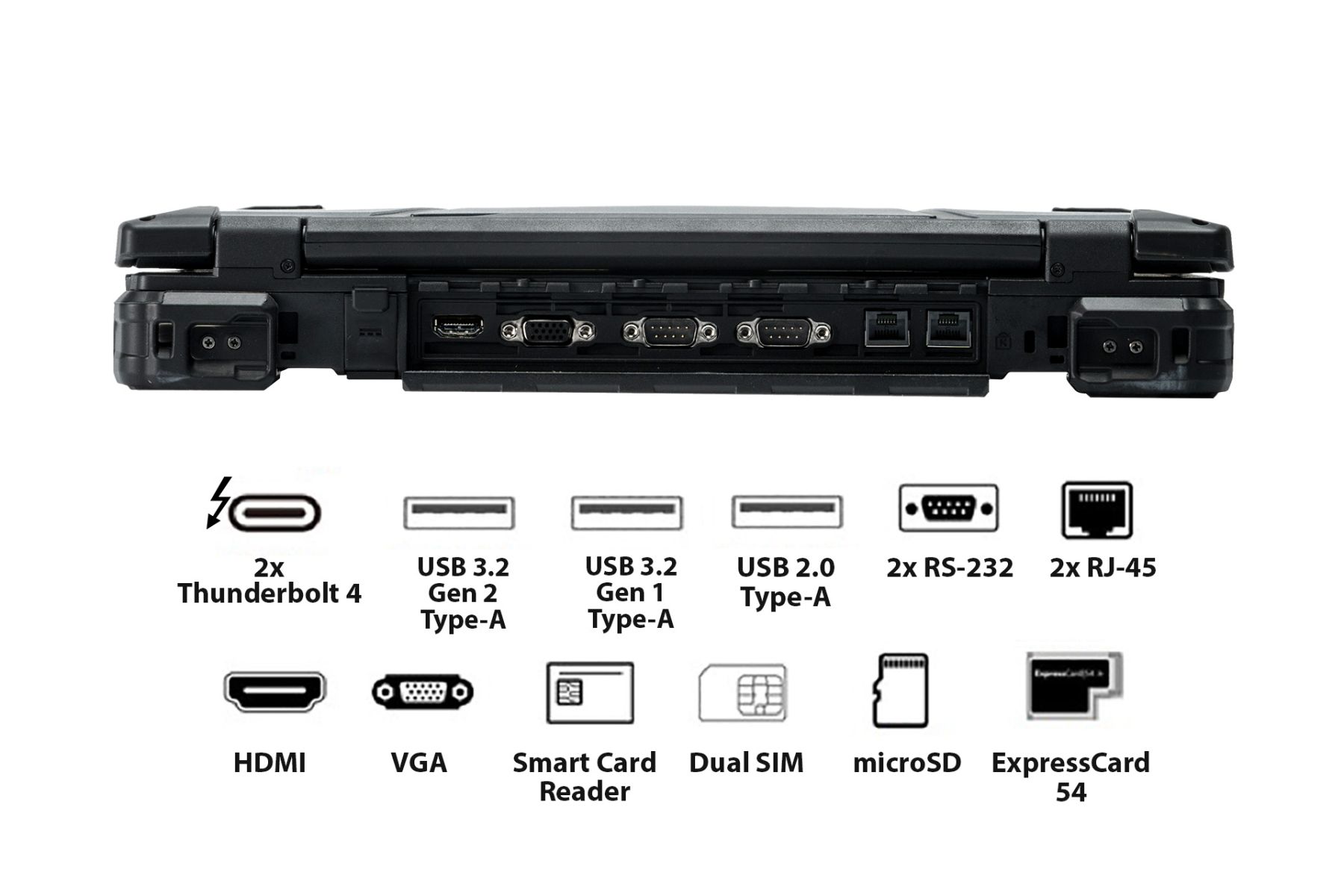 Connectors and input-output ports:1 x DC-in, 1 HDMI, 2 x Thunderbolt 4 port, Combo audio jack, 10/100/1000 Ethernet, 1 x USB 2.0 (Type A), 2 x USB 3.2 Gen 2 (Type A), Serial port, VGA, 1 MicroSD Card Reader, ExpressCard, Smart Card, Dock Connector, SIM, 1 x USB 3.2 Gen 1 (Type A)
