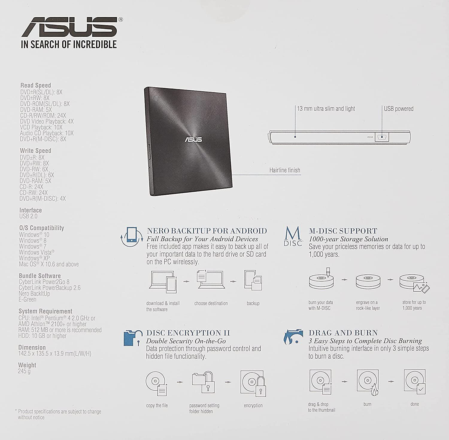 The ASUS ZenDrive U7M is an external DVD burner that comes in a slim design with a distinctive Zen-style body. One of the features of this model is its support for durable M-Disc optical media. Unlike many other optical drives, the ASUS ZenDrive U7M is compatible with M-Disc media, which has a lifespan of over a thousand years. M-Disc technology is an ideal means of archiving particularly valuable data. The ASUS ZenDrive U7M comes in a chassis that is only 13mm thick, making it an ideal accessory for thin and light notebooks.