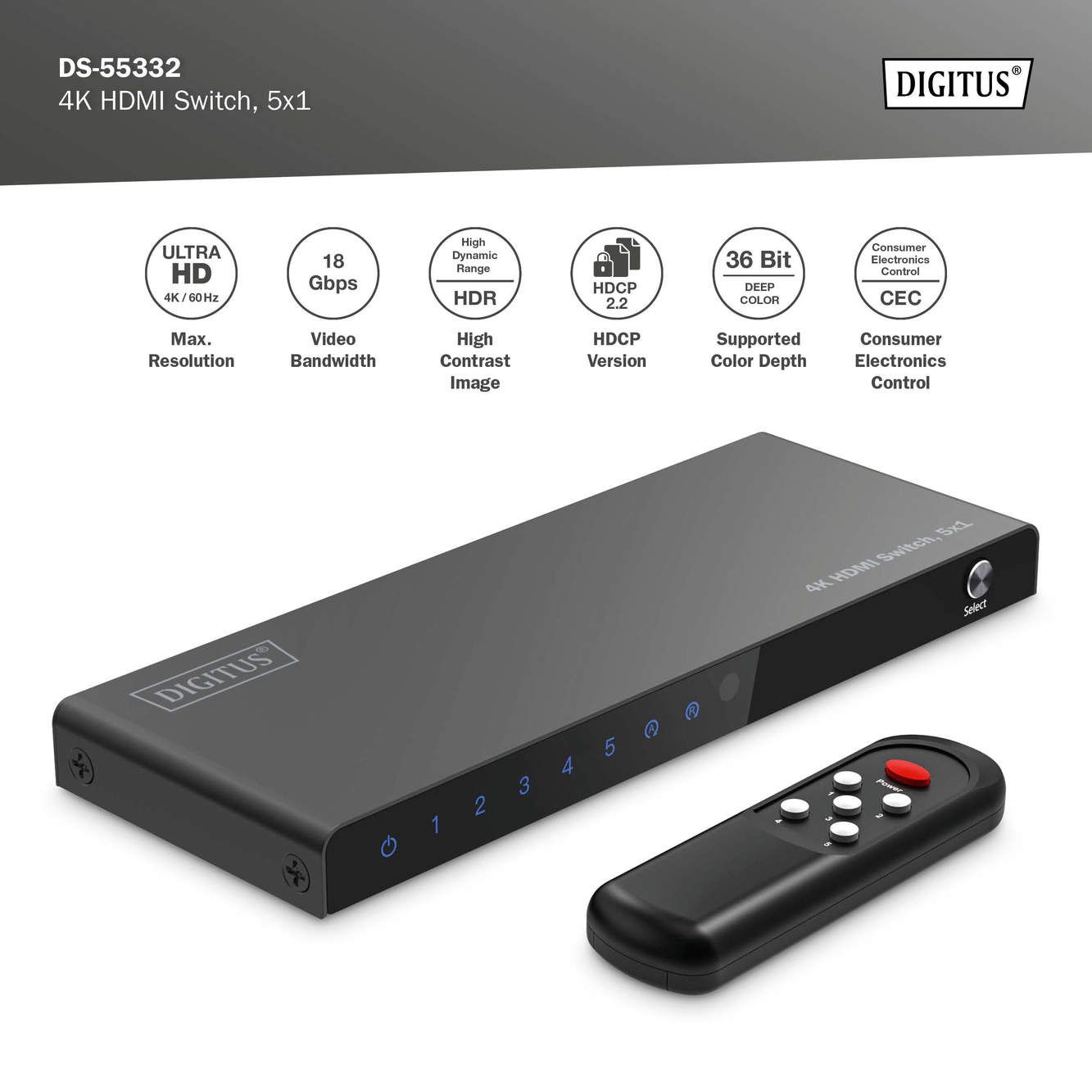 DIGITUS 5x1 HDMI Switch, 4K/60Hz HDCP 2.2