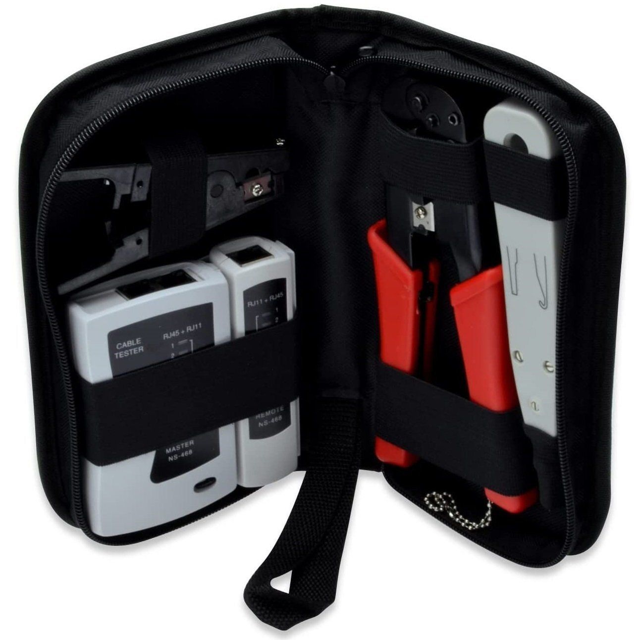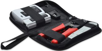 Комплектація:LAN-тестер RJ11, 12 і 45, Інструмент LSA Punch Down з кабельним різаком, Обжимний інструмент RJ11, 12 і 45, Інструмент для різання та зачистки, Текстильна сумка