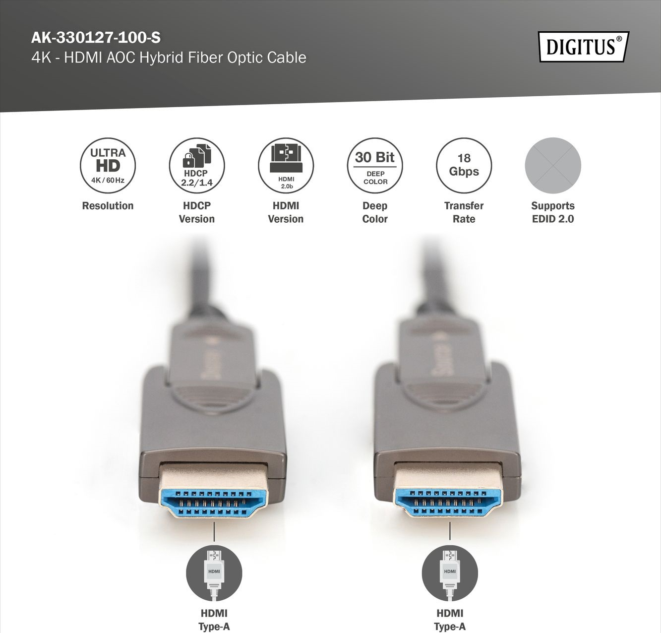Кабель DIGITUS HDMI (M/M), 4K, AOC, 10м забезпечує стабільну передачу відео та аудіо високої чіткості на великі відстані. Компактні штекери та знімні адаптери дозволяють гнучко підключати кабель навіть у вузьких місцях. Гібридна конструкція з міді та оптоволокна запобігає електромагнітним перешкодам і гарантує беззбиткову передачу сигналу. Простий у використанні завдяки Plug and Play.