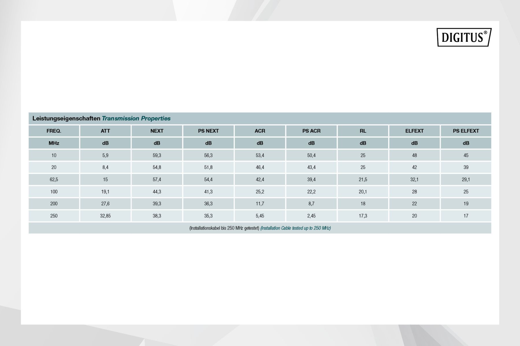 - QUALITY CHARACTERISTICS: LAN cable is unshielded (U/UTP shielding) – Channel link GHMT certified – Standards: ANSI/TIA-568-C, ISO/IEC 11801, IEC 61156-5, DIN EN 50173-1/4, DIN EN 50288-6-1, IEC 60332-1-2, EN 50174-2