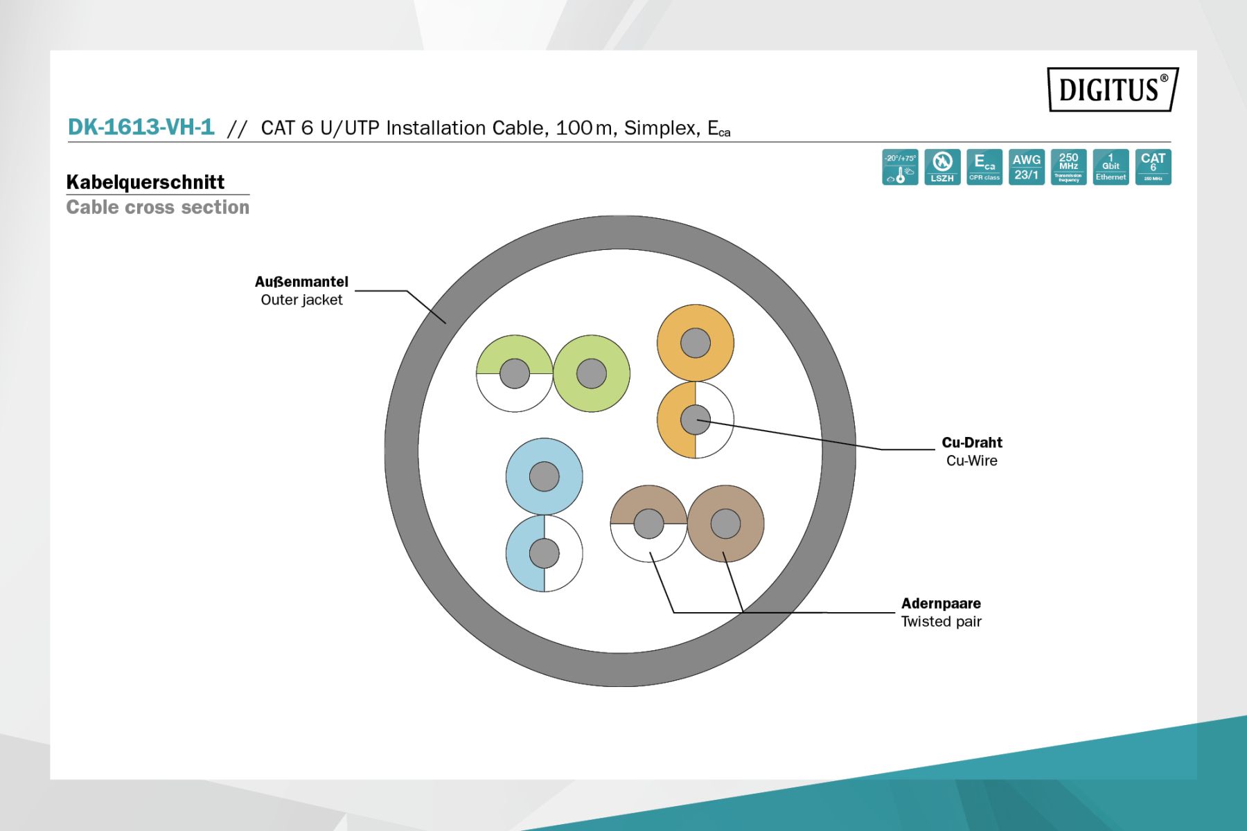 CAT 6 U-UTP installation cable, 250 MHz Eca (EN 50575), AWG 23/1, 100m paper box, sx, pu